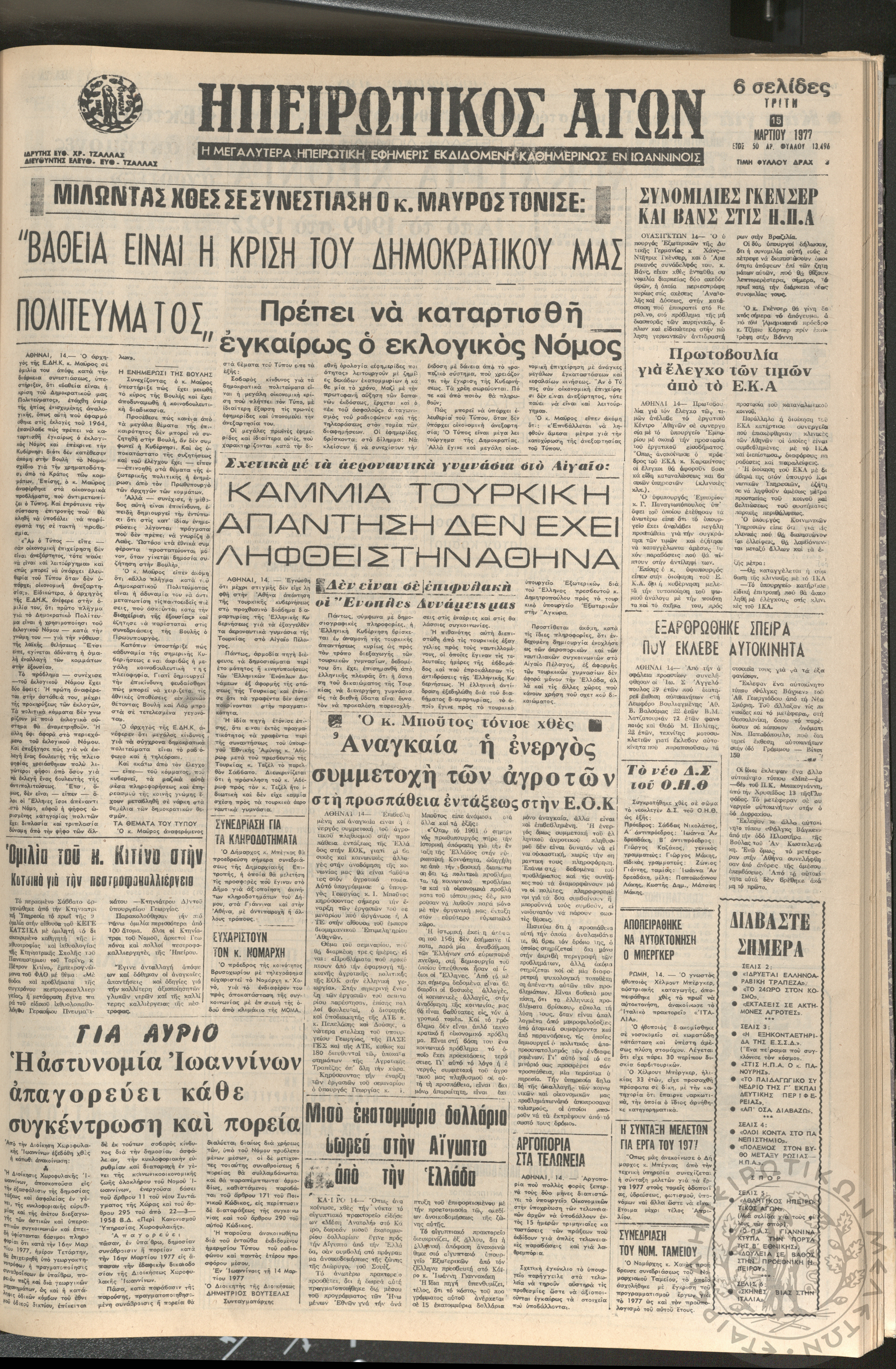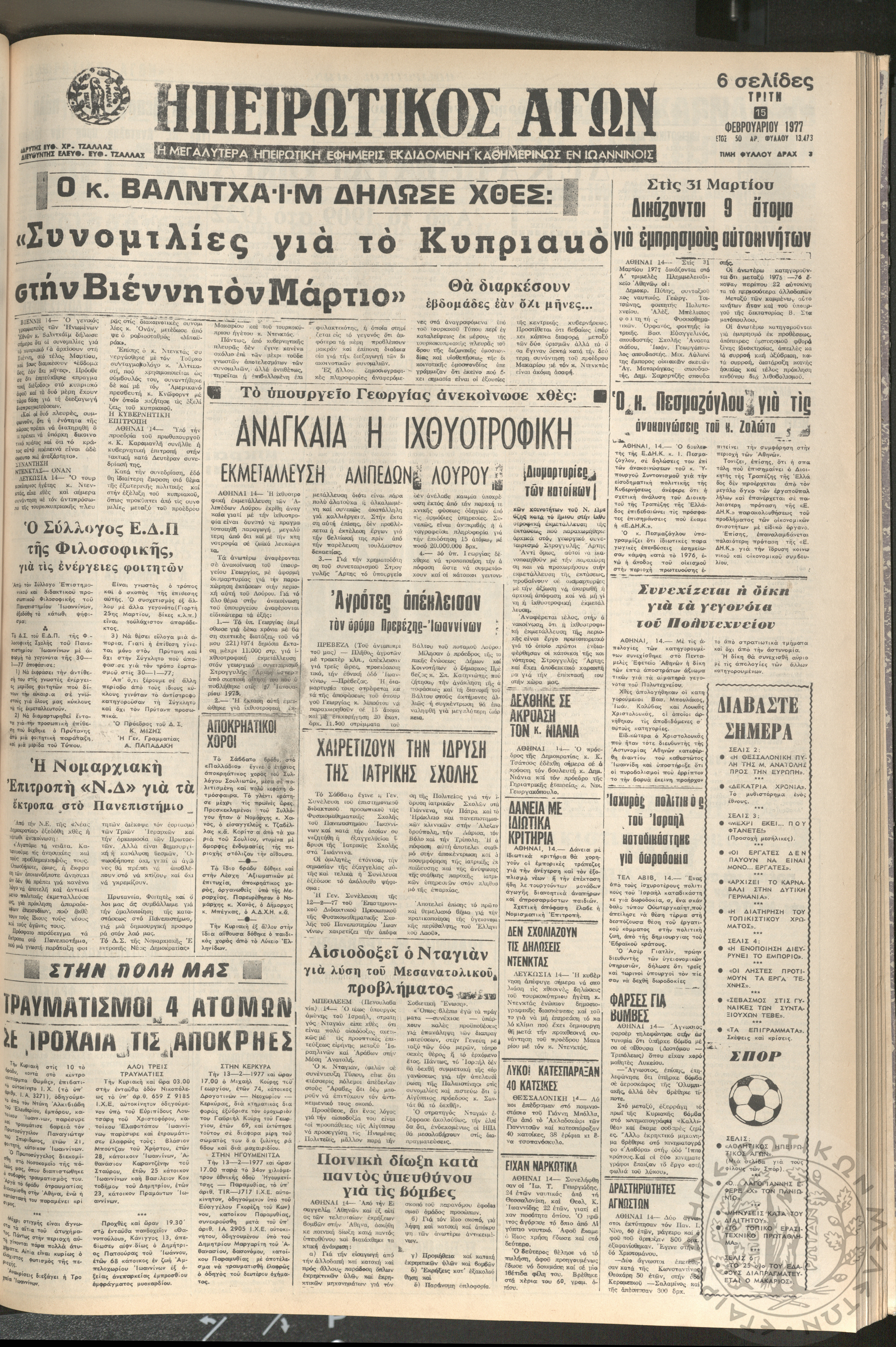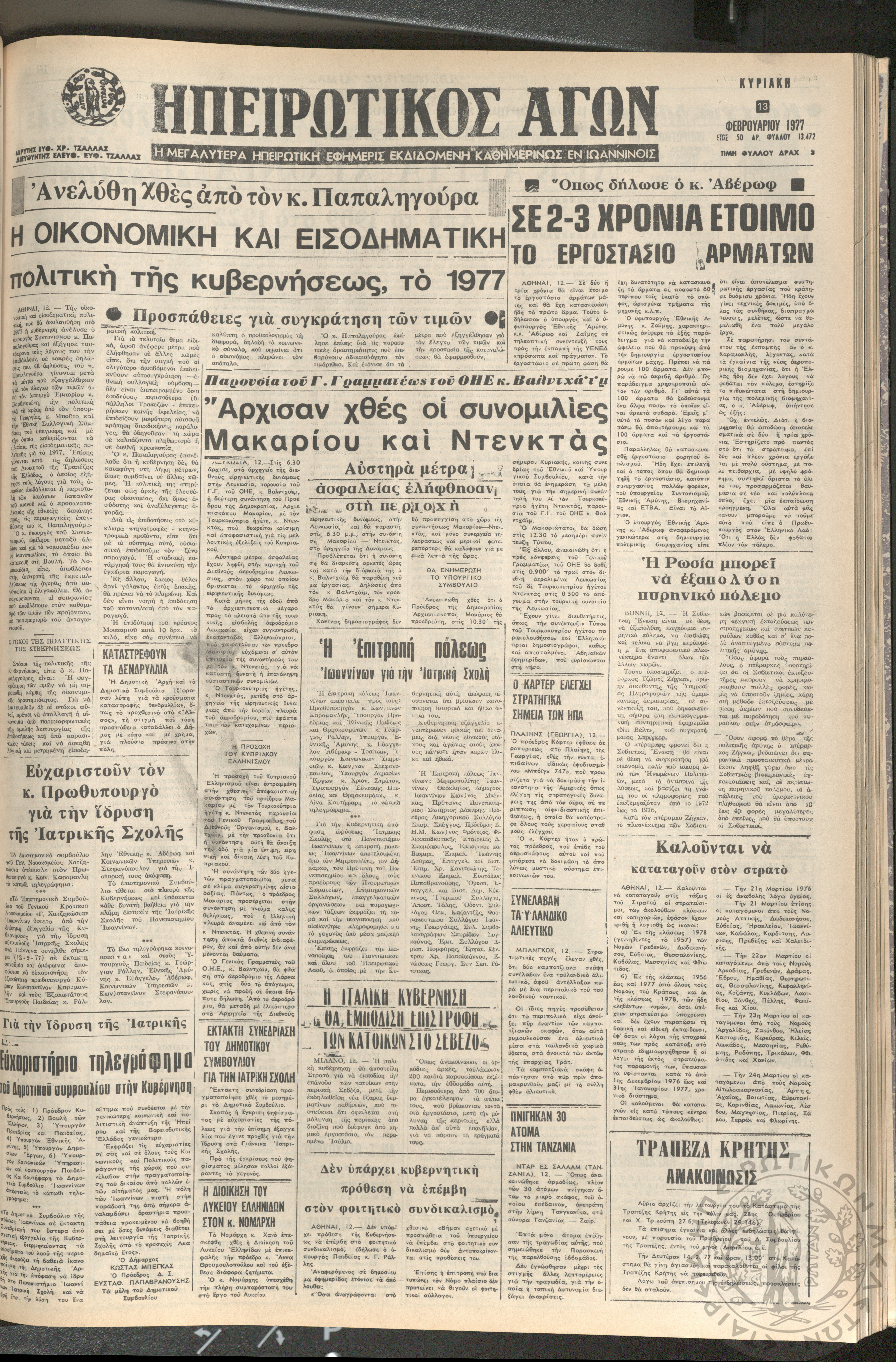 Ηπειρωτικός Αγών: η μεγαλυτέρα ηπειρωτική εφημερίς εκδιδόμενη καθημερινώς εν Ιωαννίνοις 1977 (φ. 13495)Έτος 50, φ. 13495...
