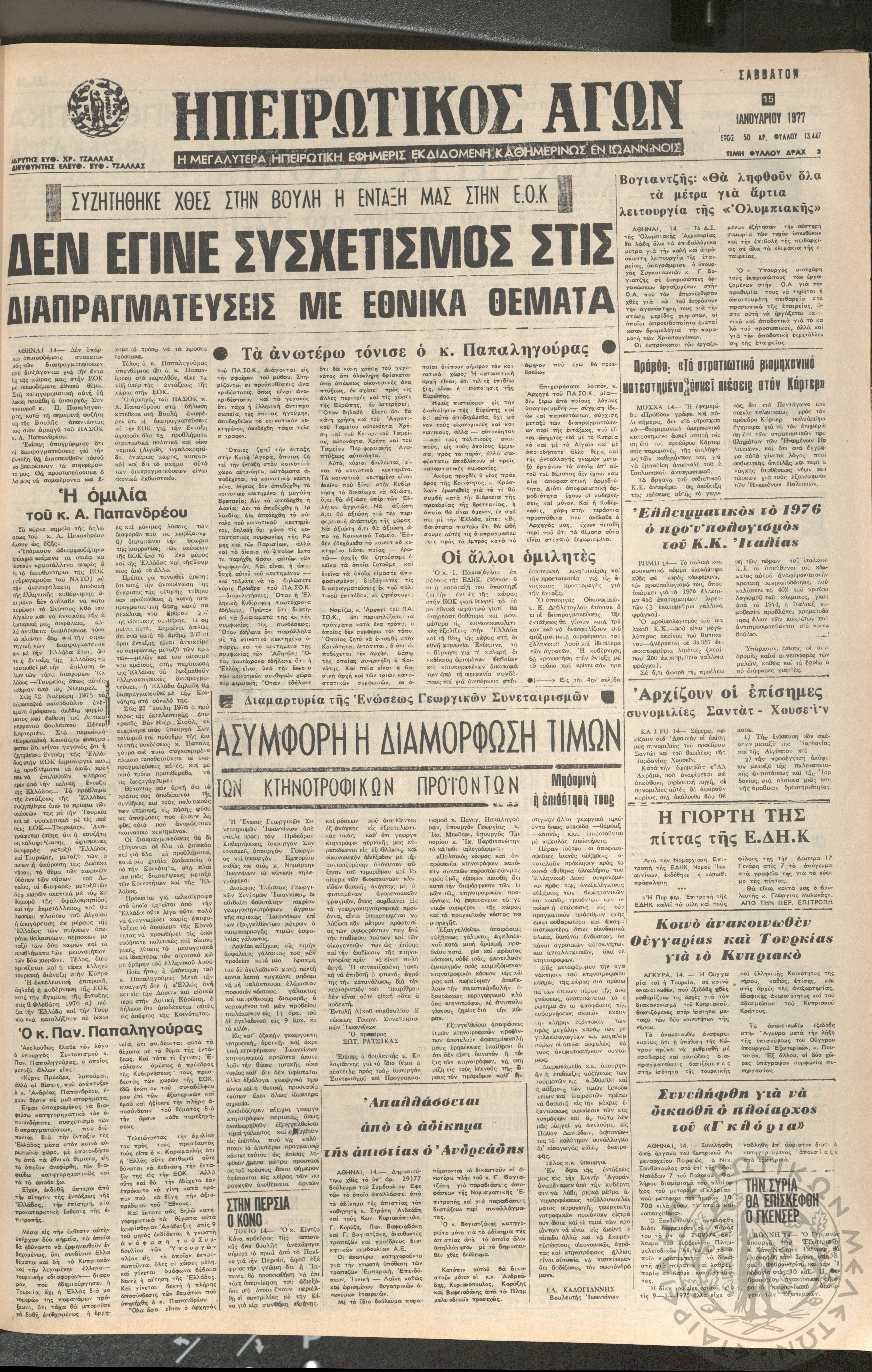 Ηπειρωτικός Αγών: η μεγαλυτέρα ηπειρωτική εφημερίς εκδιδόμενη καθημερινώς εν Ιωαννίνοις 1977 (φ. 13447 )Έτος 50, φ. 13447...