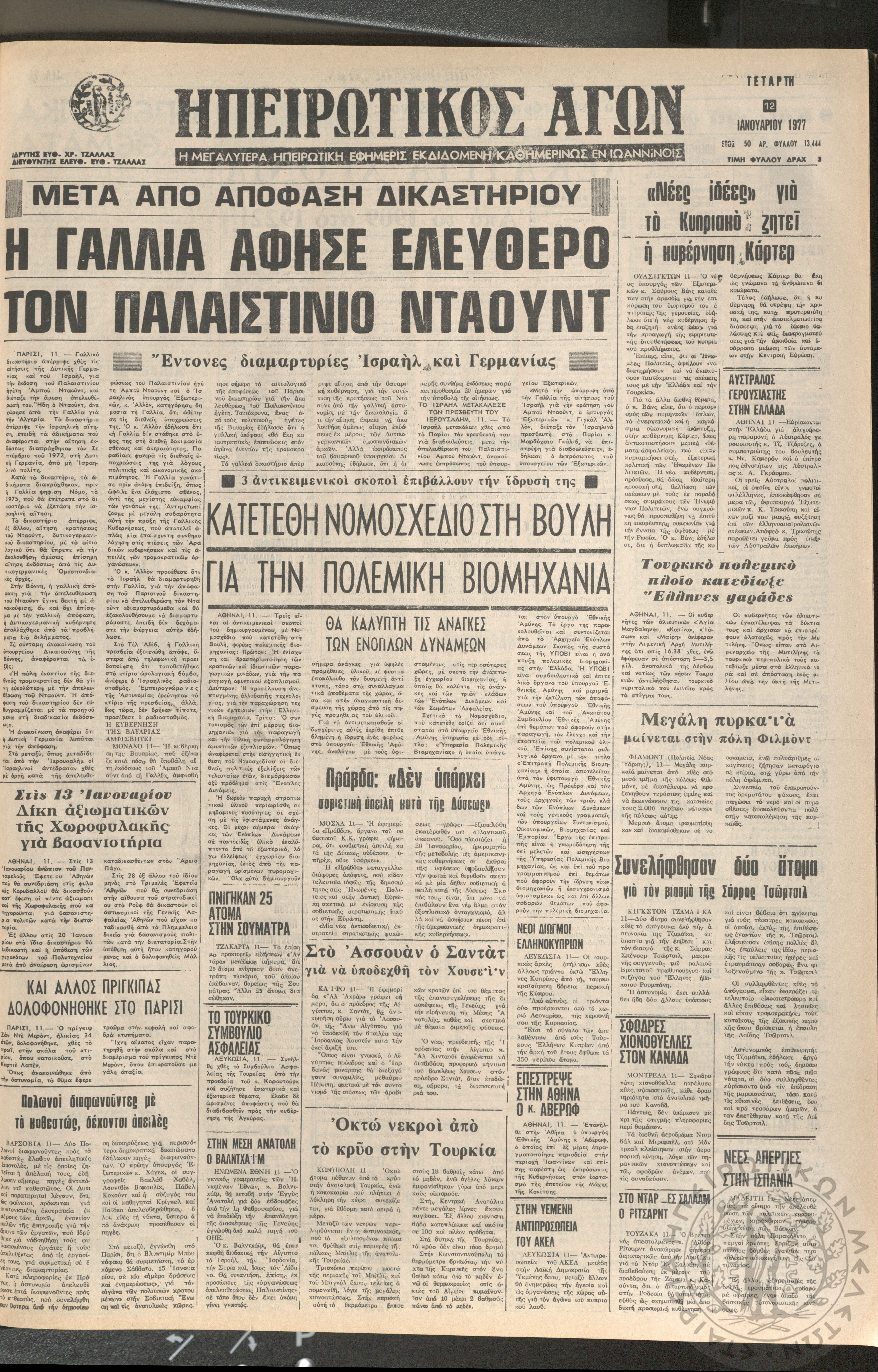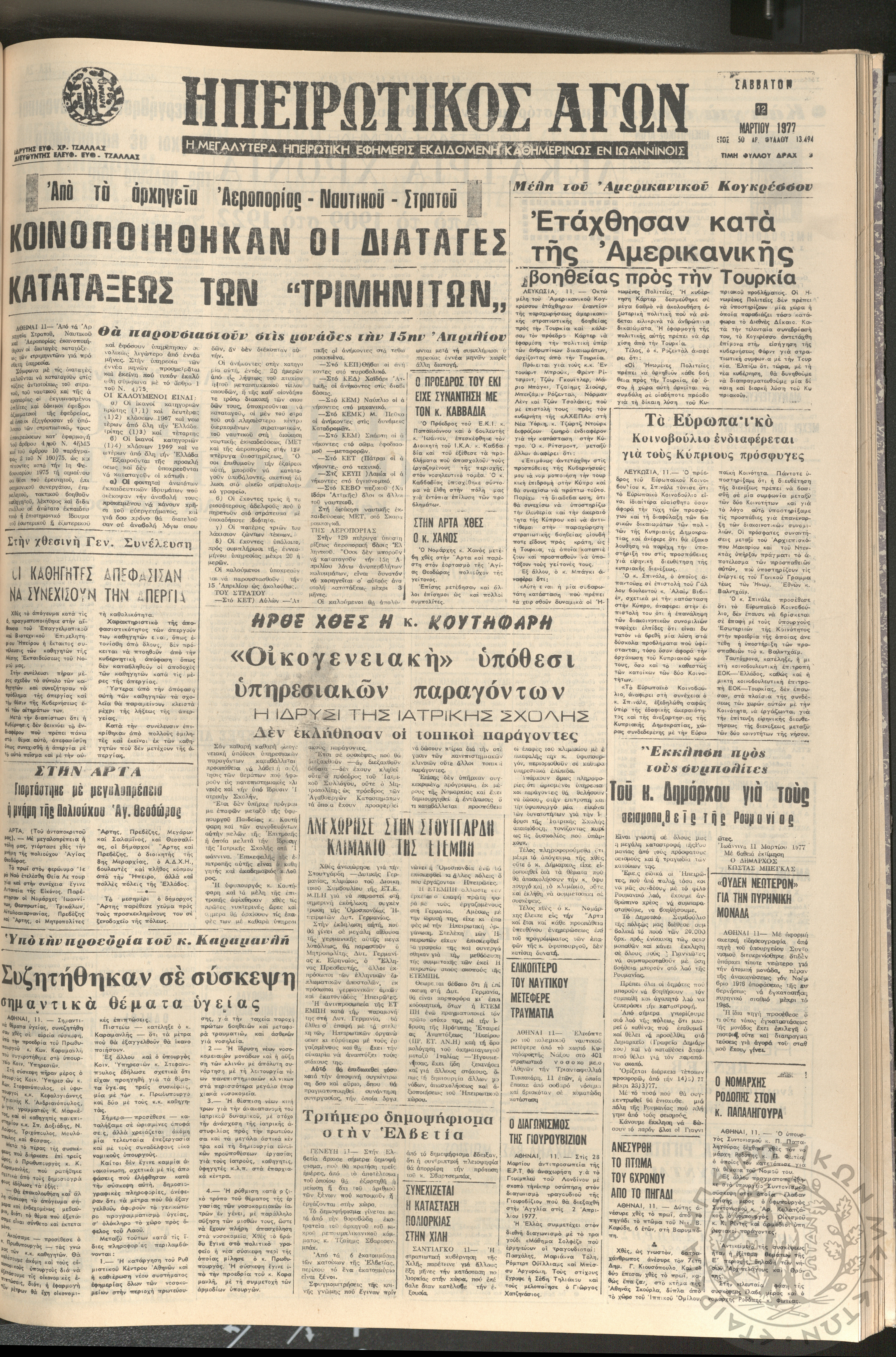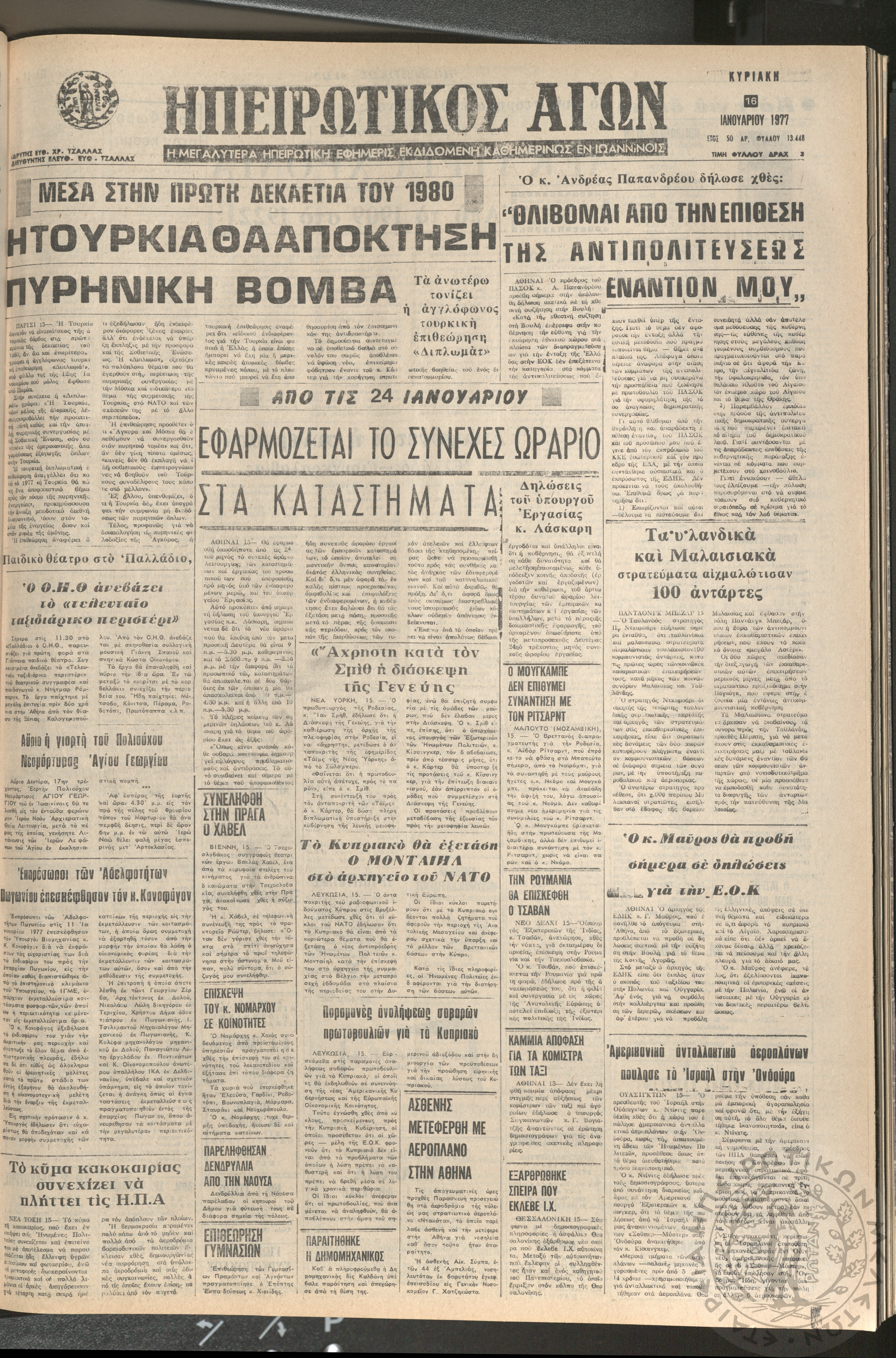 Ηπειρωτικός Αγών: η μεγαλυτέρα ηπειρωτική εφημερίς εκδιδόμενη καθημερινώς εν Ιωαννίνοις 1977 (φ. 13444)Έτος 50, φ. 13444...