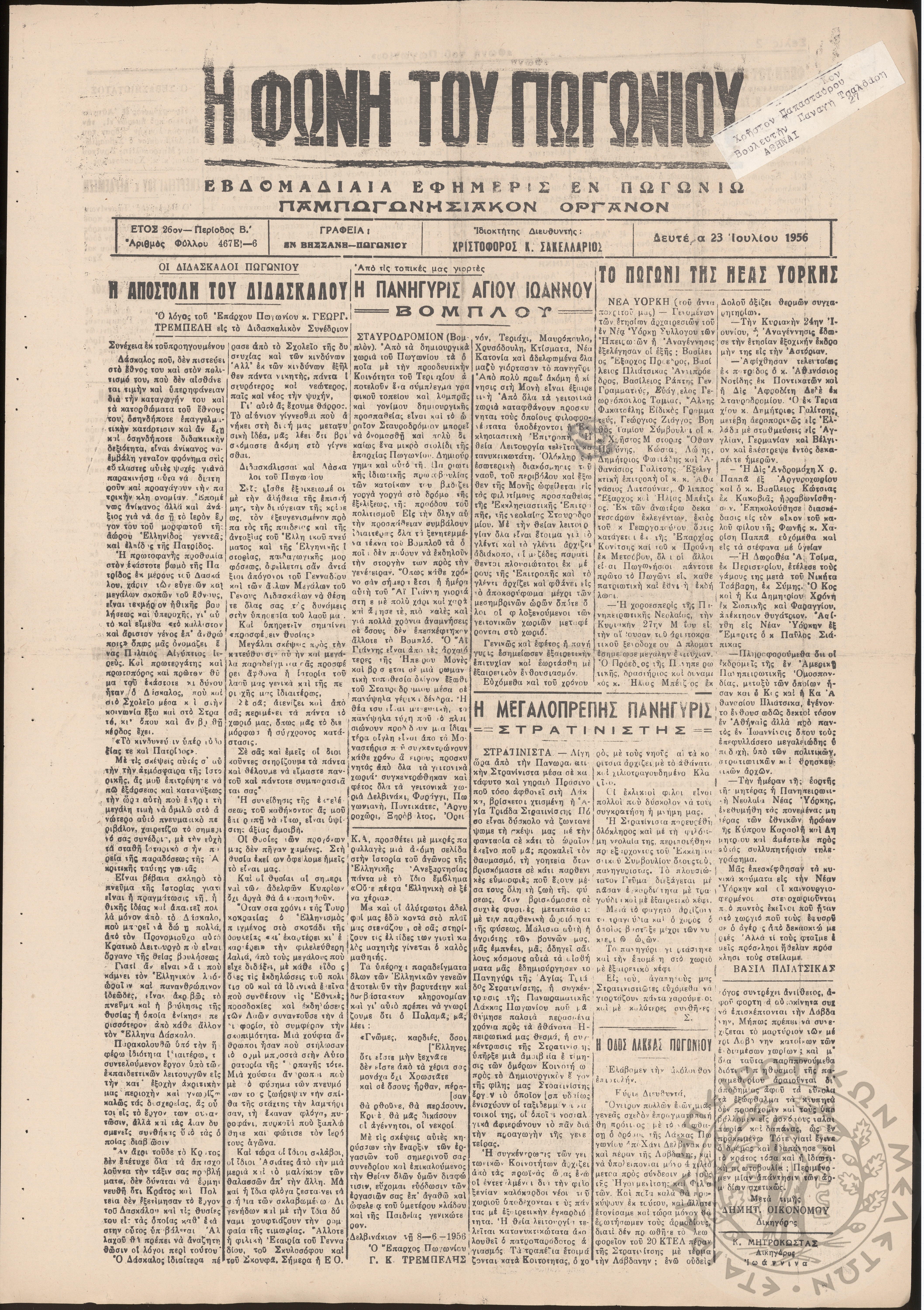 Η φωνή του Πωγωνίου: εβδομαδιαία εφημερίς εν Πωγωνίω (Παμπωγωνησιακόν όργανον), 1956, φ. 467Έτος 26, φ. 467...