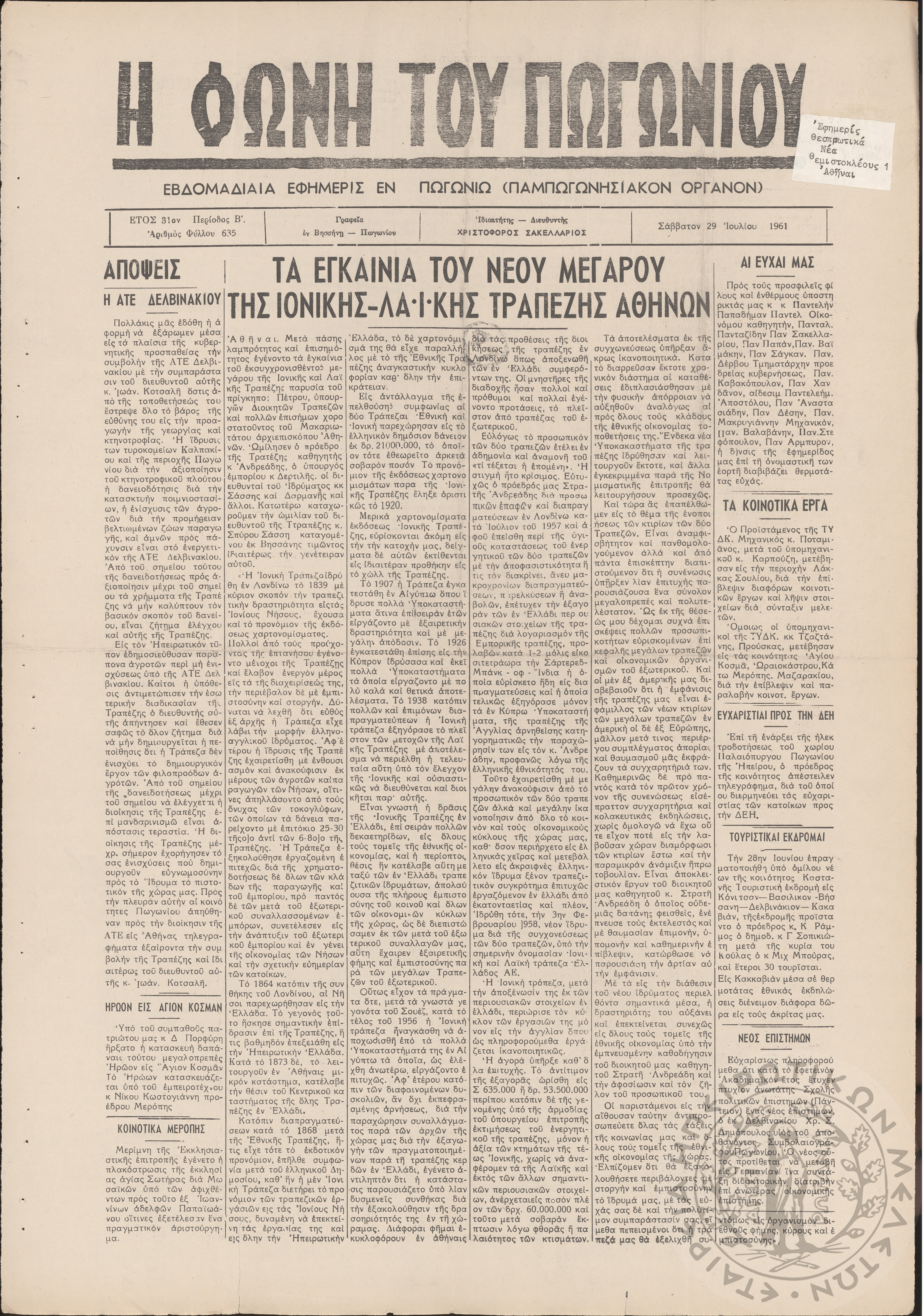 Η φωνή του Πωγωνίου: εβδομαδιαία εφημερίς εν Πωγωνίω (Παμπωγωνησιακόν όργανον), 1961, φ. 635Έτος 31, φ. 635...