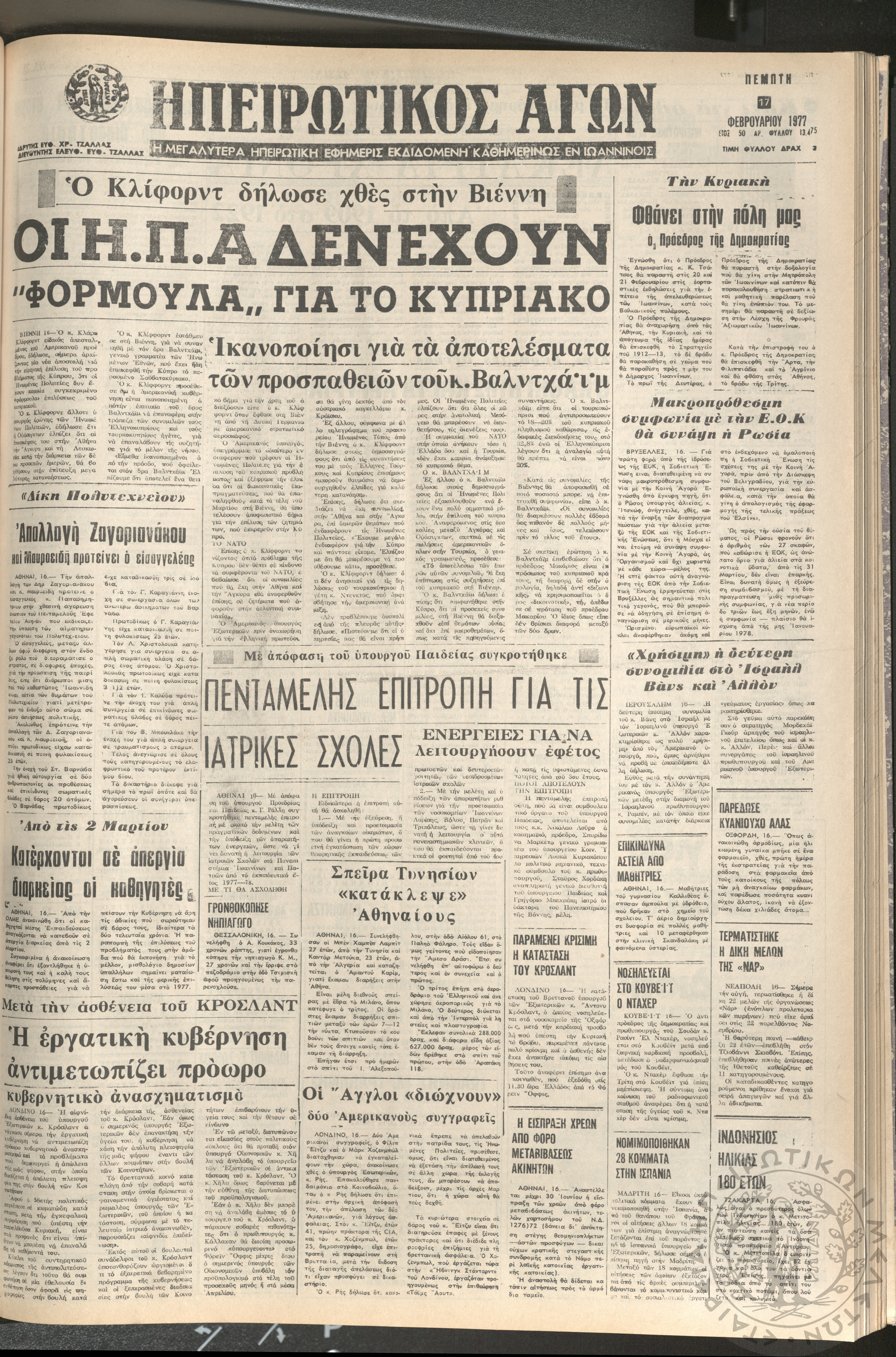 Ηπειρωτικός Αγών: η μεγαλυτέρα ηπειρωτική εφημερίς εκδιδόμενη καθημερινώς εν Ιωαννίνοις 1977 (φ. 13475)Έτος 50, φ. 13475...