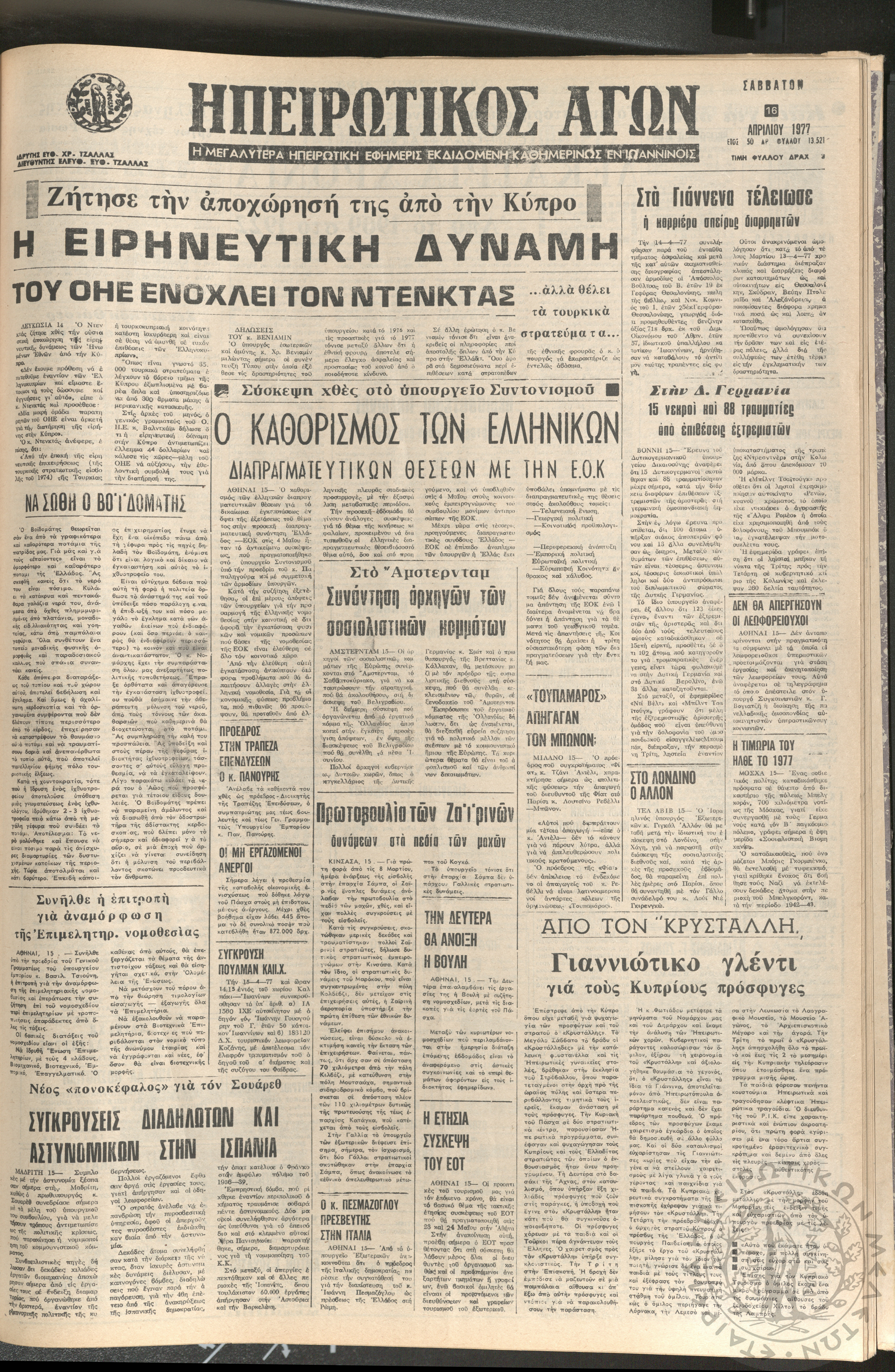 Ηπειρωτικός Αγών: η μεγαλυτέρα ηπειρωτική εφημερίς εκδιδόμενη καθημερινώς εν Ιωαννίνοις 1977 (φ. 13521)Έτος 50, φ. 13521...