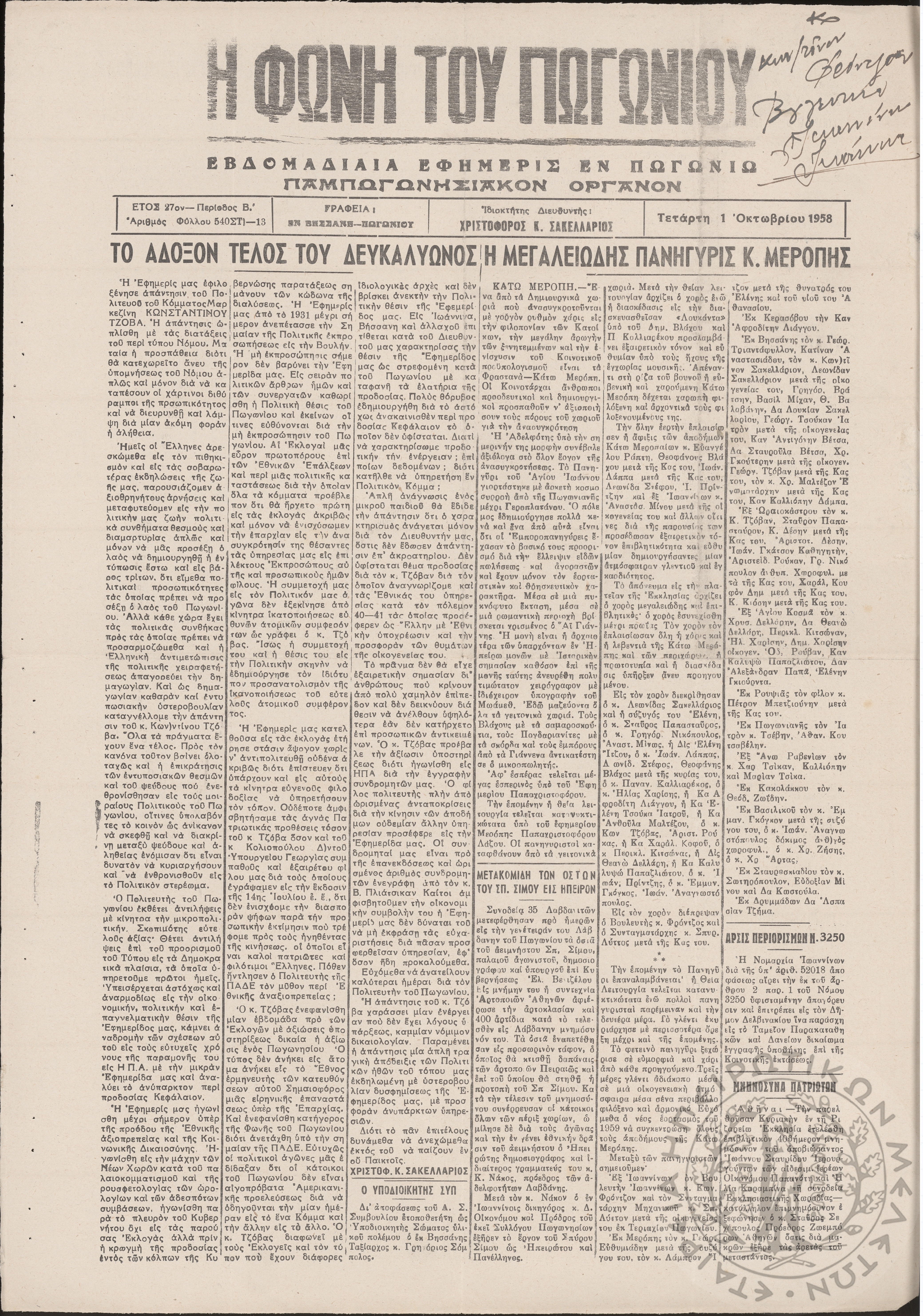 Η φωνή του Πωγωνίου: εβδομαδιαία εφημερίς εν Πωγωνίω (Παμπωγωνησιακόν όργανον), 1958, φ. 540Έτος 27, φ. 540...