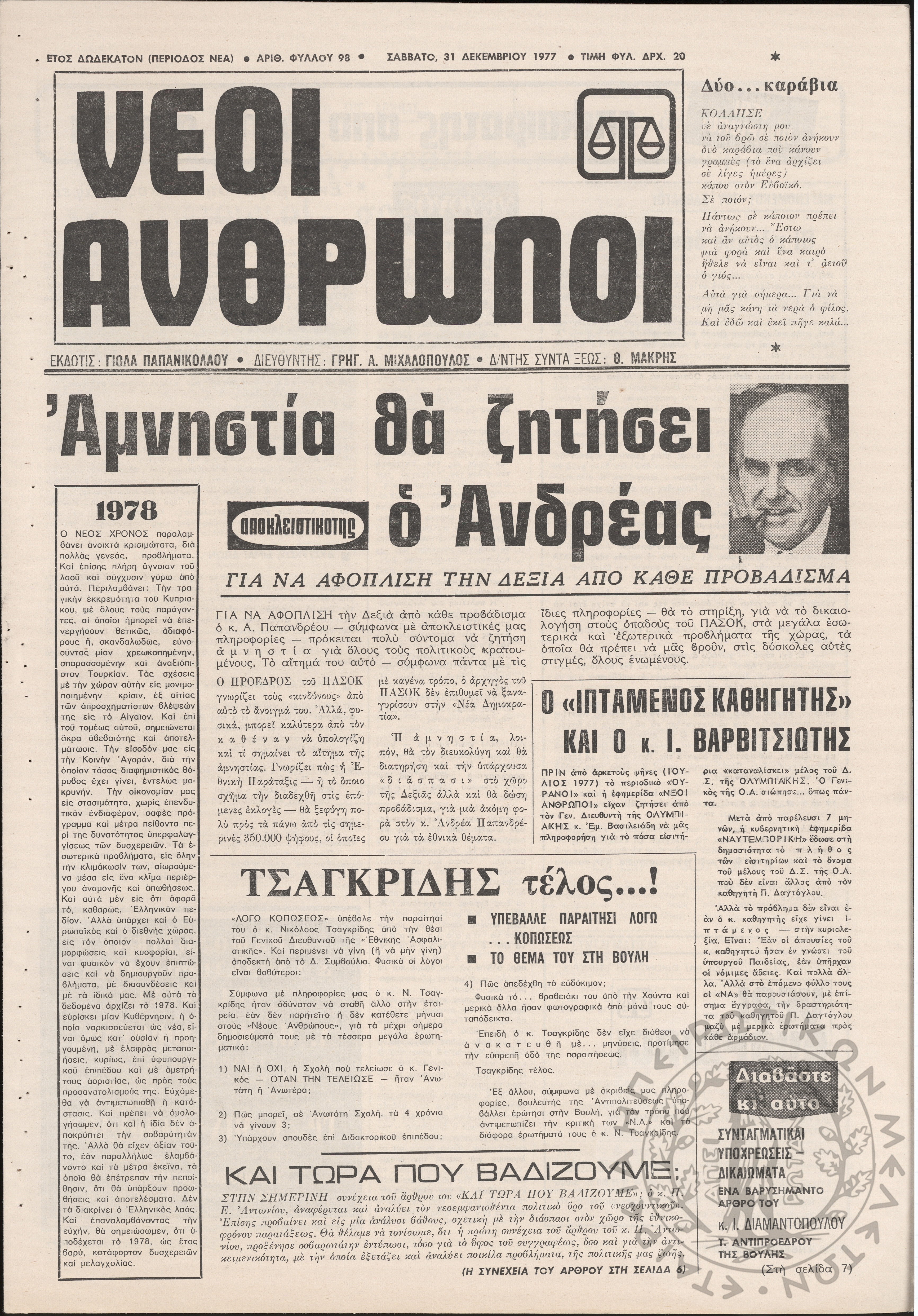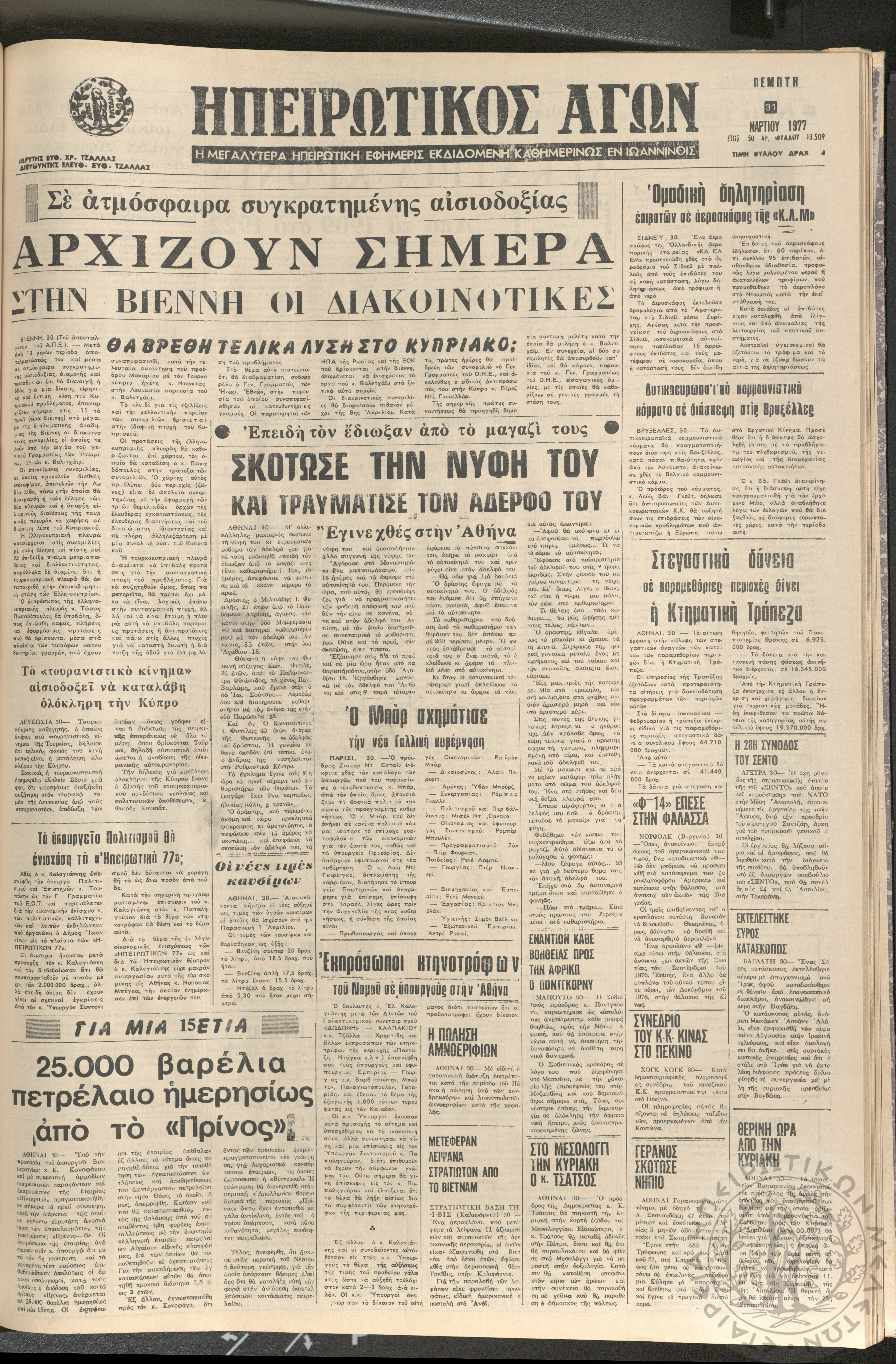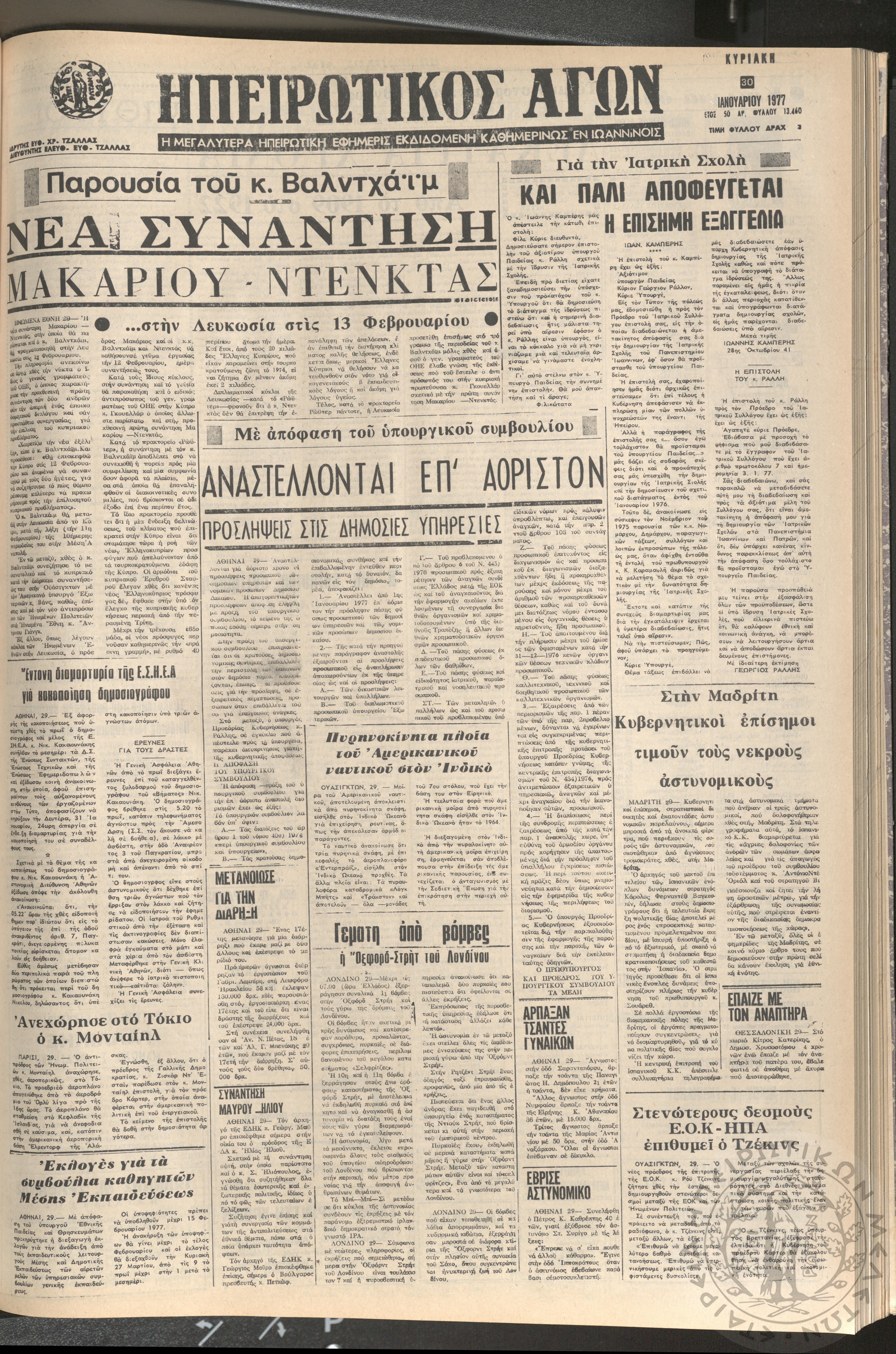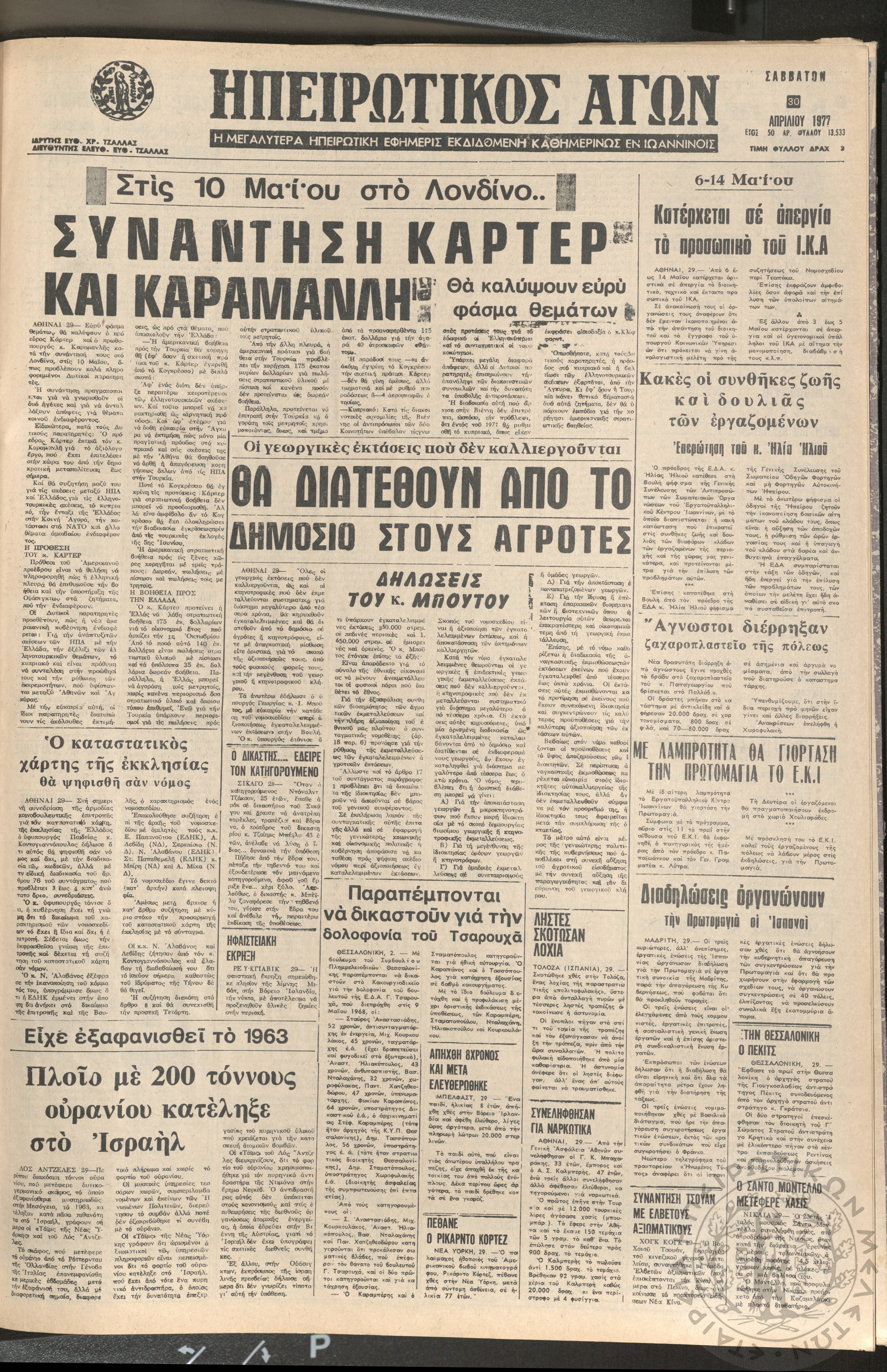 Ηπειρωτικός Αγών: η μεγαλυτέρα ηπειρωτική εφημερίς εκδιδόμενη καθημερινώς εν Ιωαννίνοις 1977 (φ. 13533)Έτος 50, Φ. 13533...