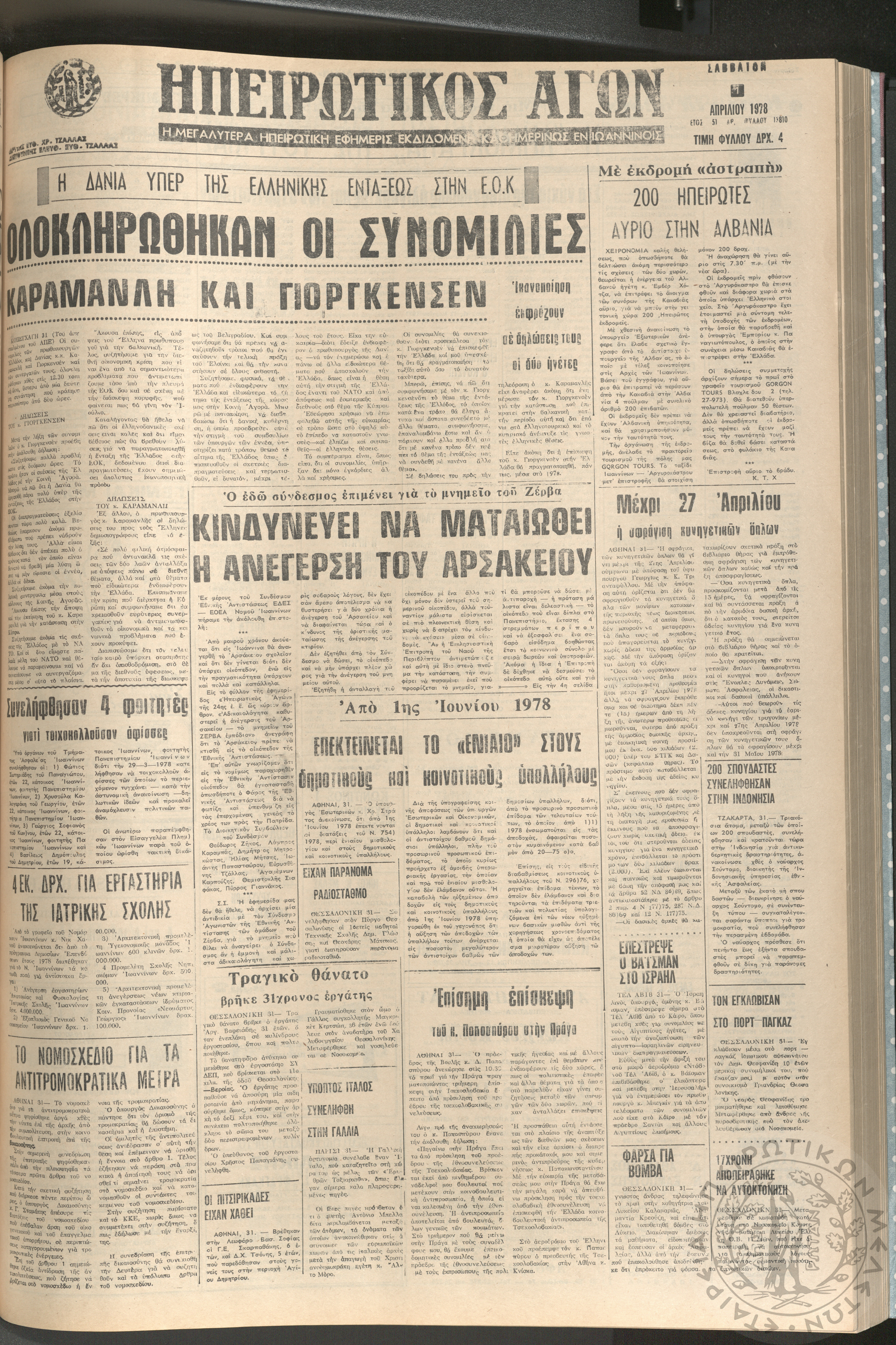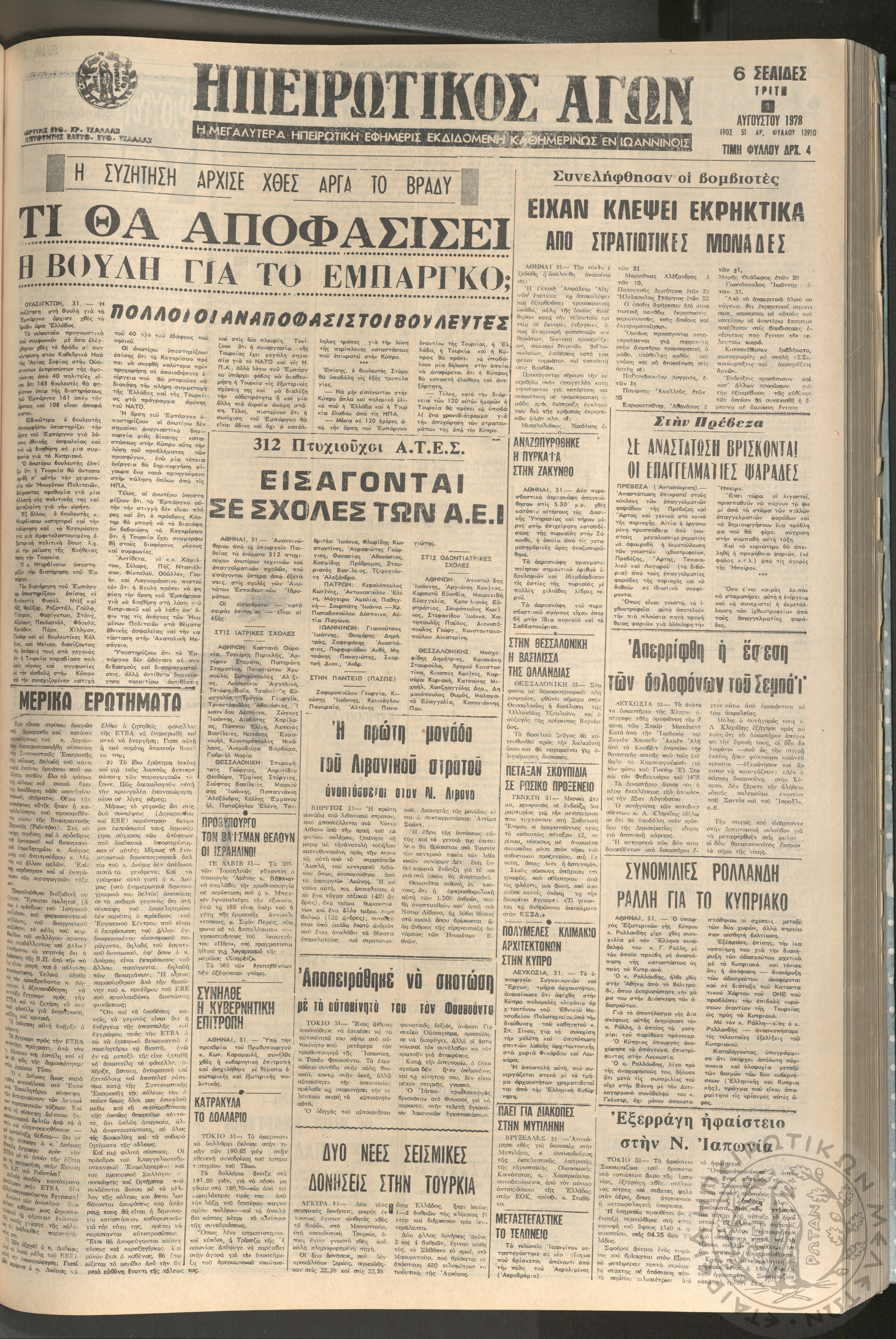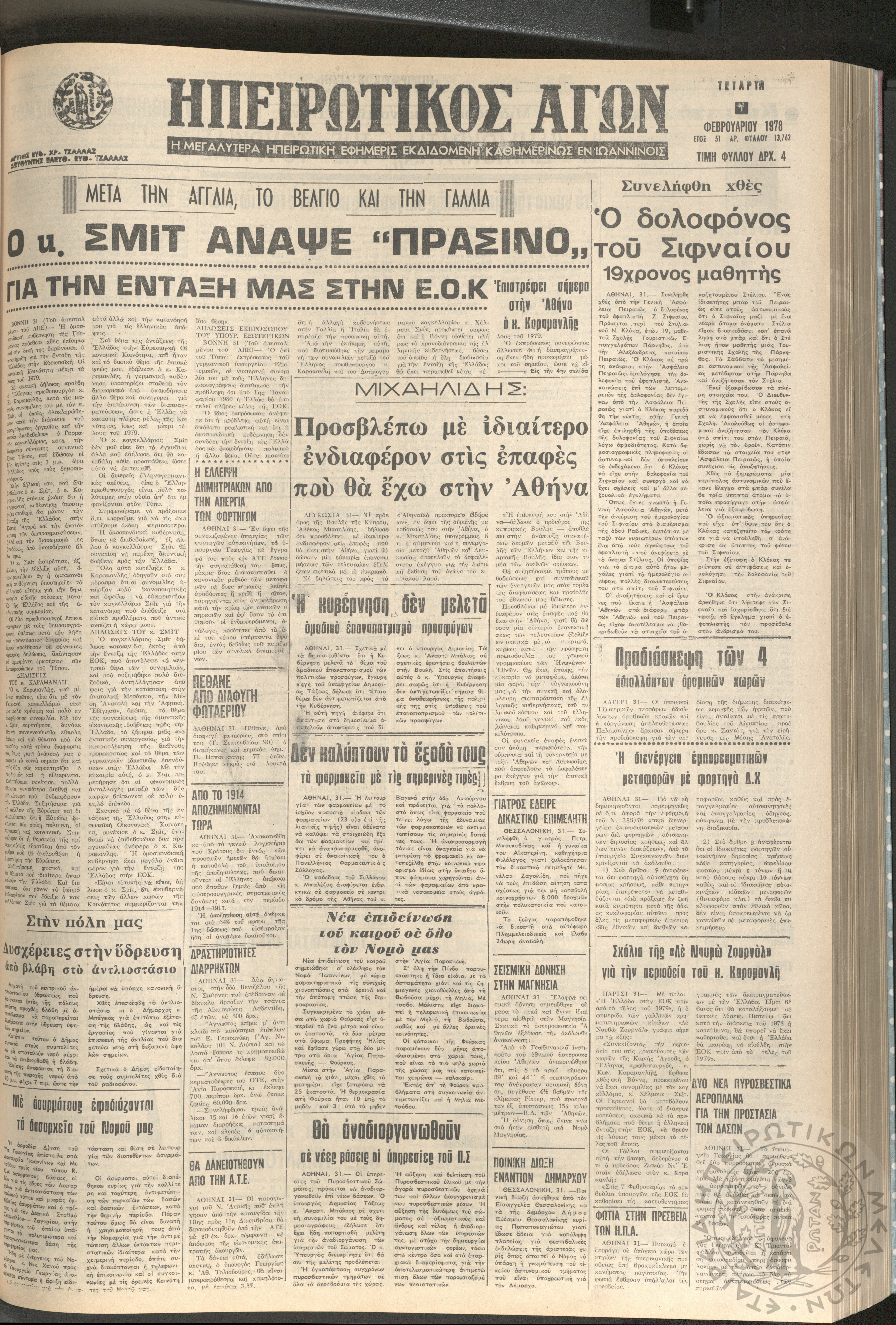 Ηπειρωτικός Αγών: η μεγαλυτέρα ηπειρωτική εφημερίς εκδιδόμενη καθημερινώς εν Ιωαννίνοις, 1978, φ. 13910Έτος 51, φ. 13910...