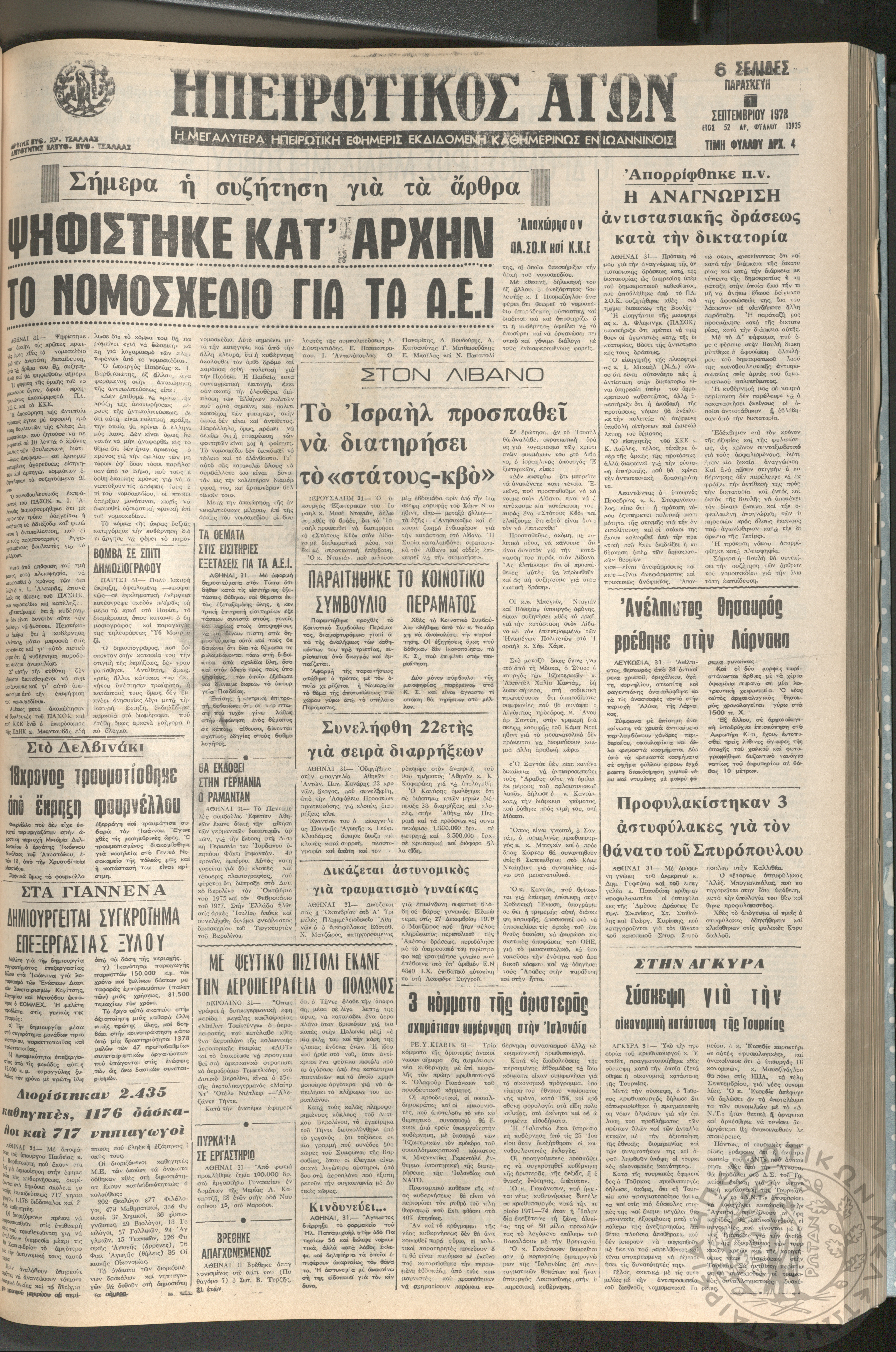 Ηπειρωτικός Αγών: η μεγαλυτέρα ηπειρωτική εφημερίς εκδιδόμενη καθημερινώς εν Ιωαννίνοις, 1978, φ. 13935Έτος 52, φ. 13935...