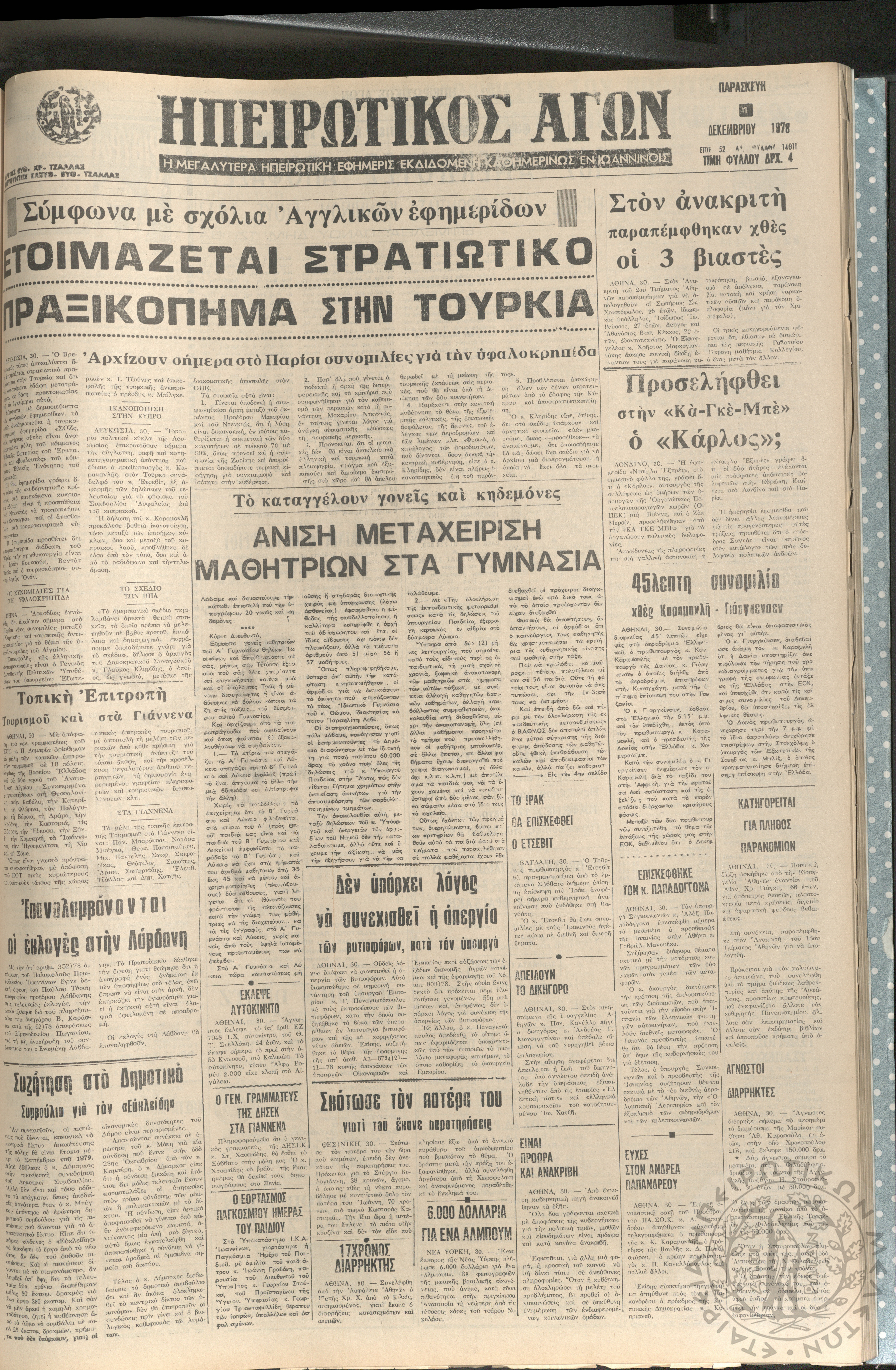 Ηπειρωτικός Αγών: η μεγαλυτέρα ηπειρωτική εφημερίς εκδιδόμενη καθημερινώς εν Ιωαννίνοις, 1978, φ. 14012Έτος 52, φ. 14012...
