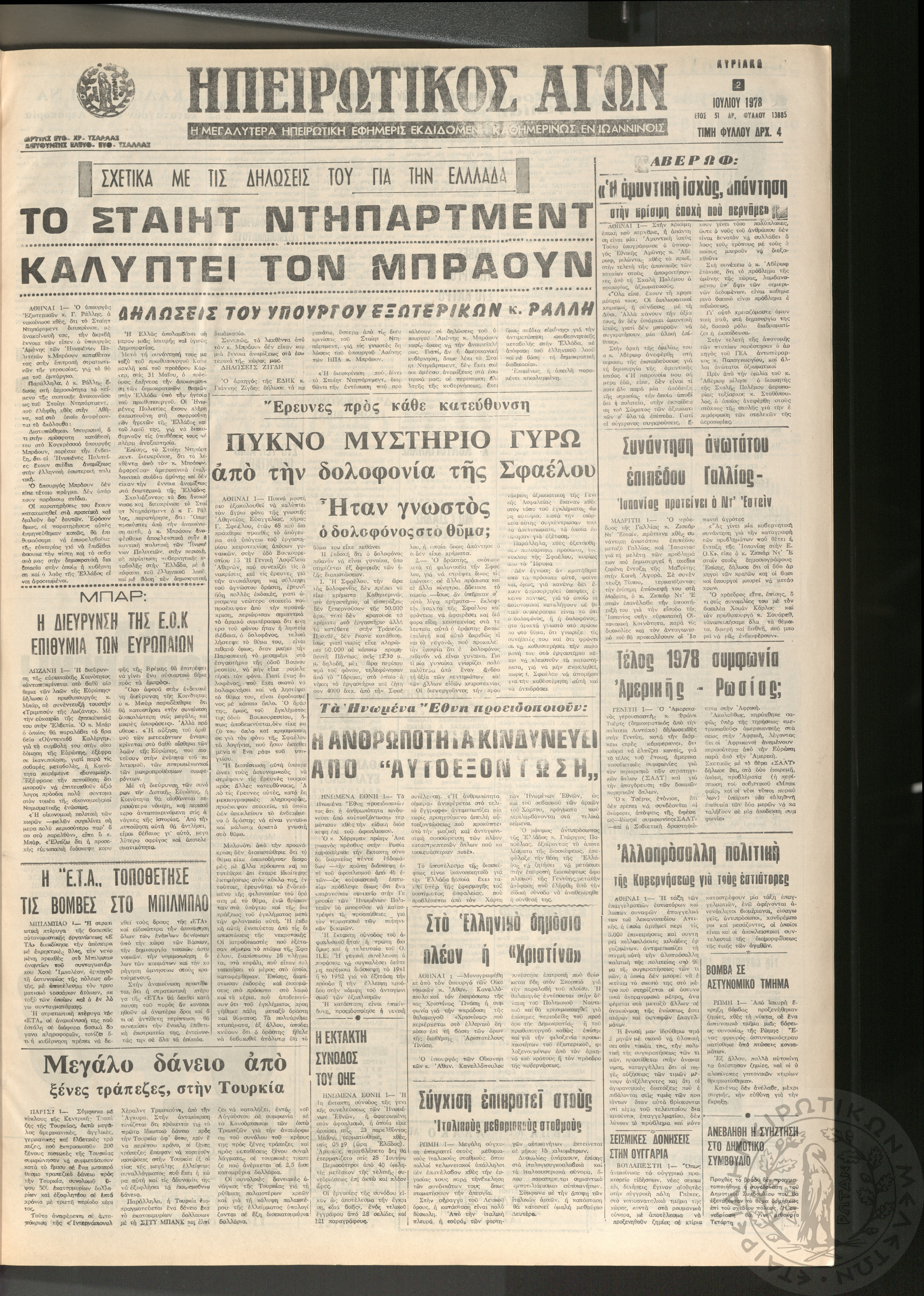 Ηπειρωτικός Αγών: η μεγαλυτέρα ηπειρωτική εφημερίς εκδιδόμενη καθημερινώς εν Ιωαννίνοις, 1978, φ. 13885Έτος 51, φ. 13885...