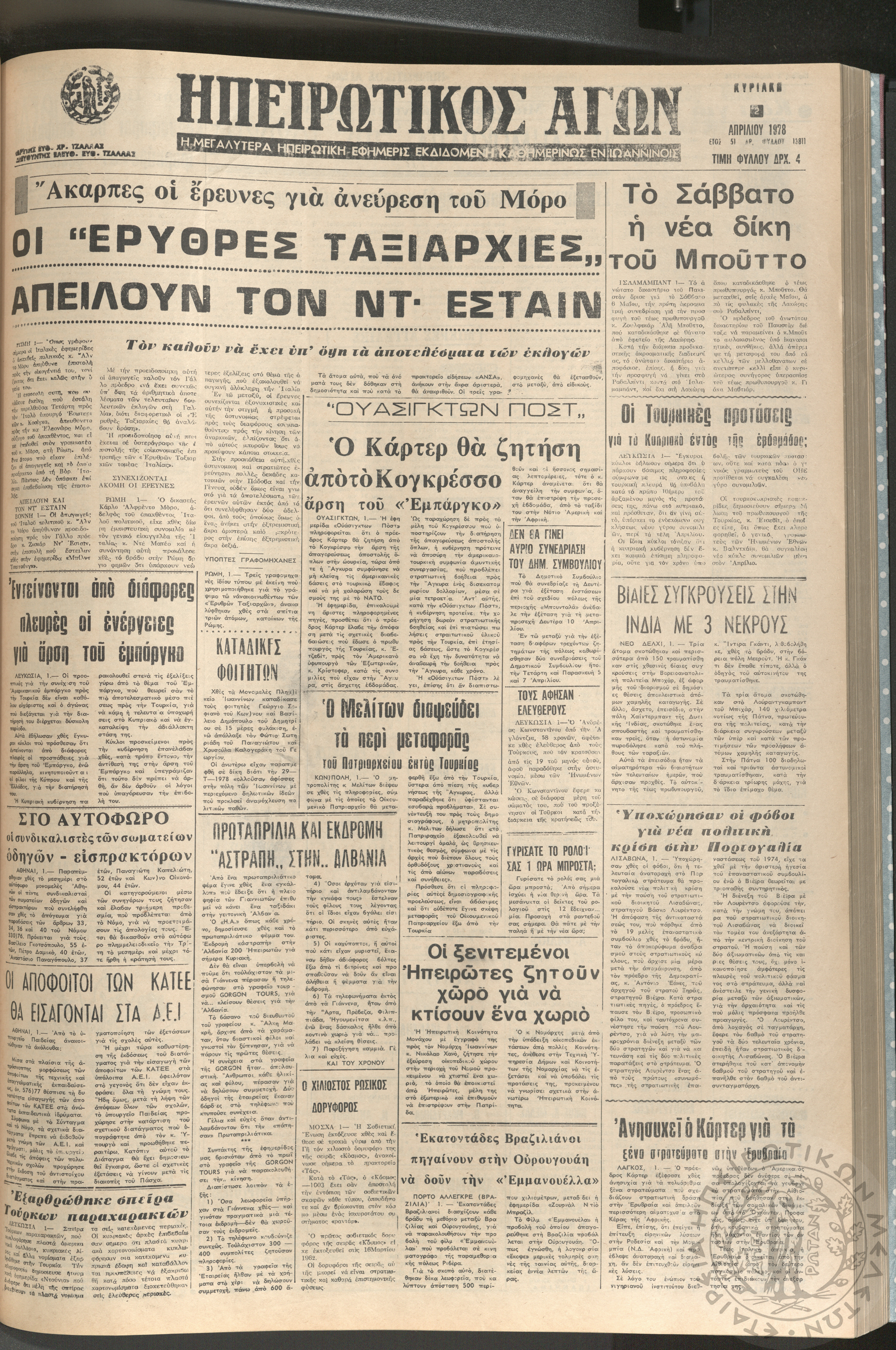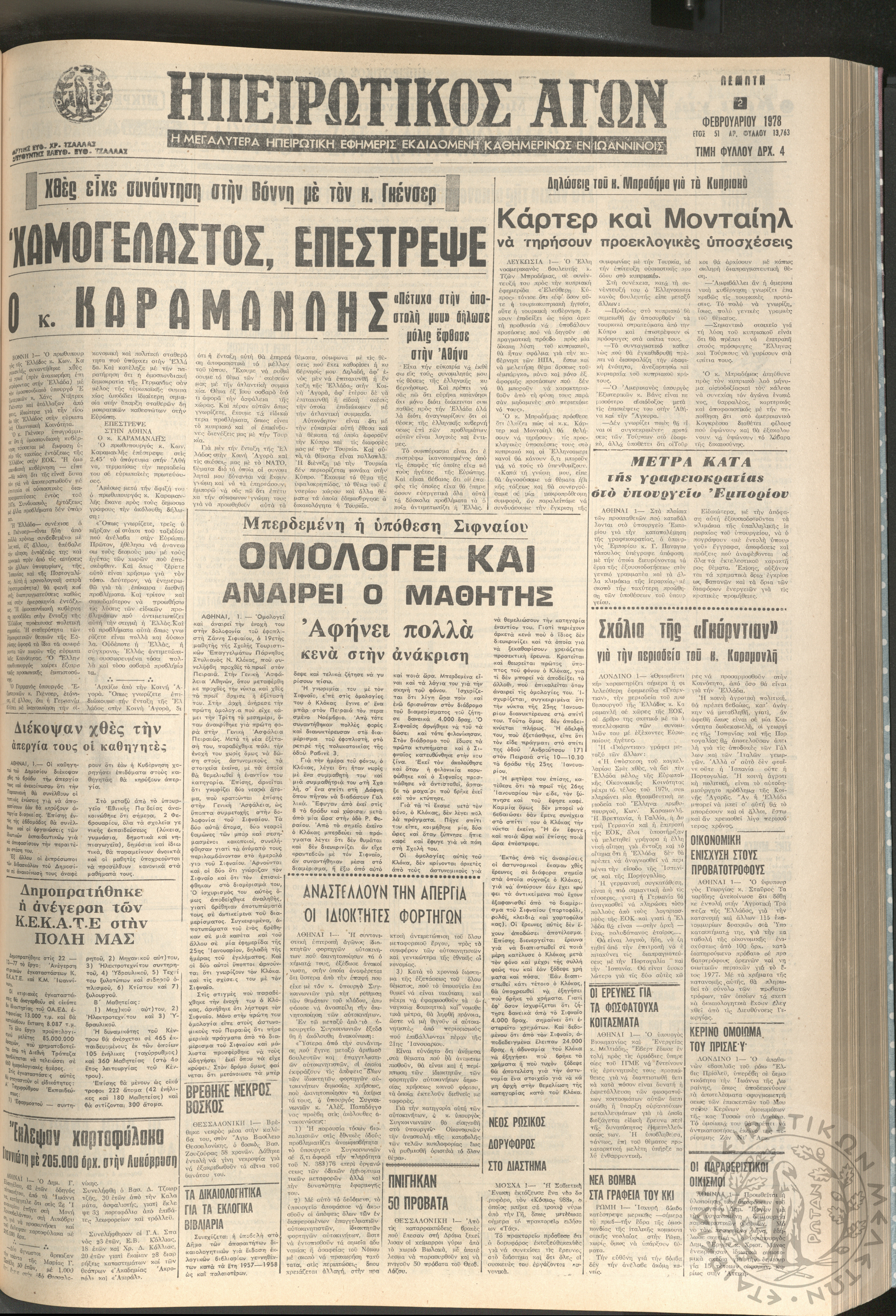 Ηπειρωτικός Αγών: η μεγαλυτέρα ηπειρωτική εφημερίς εκδιδόμενη καθημερινώς εν Ιωαννίνοις, 1978, φ. 13763Έτος 51, φ. 13763...