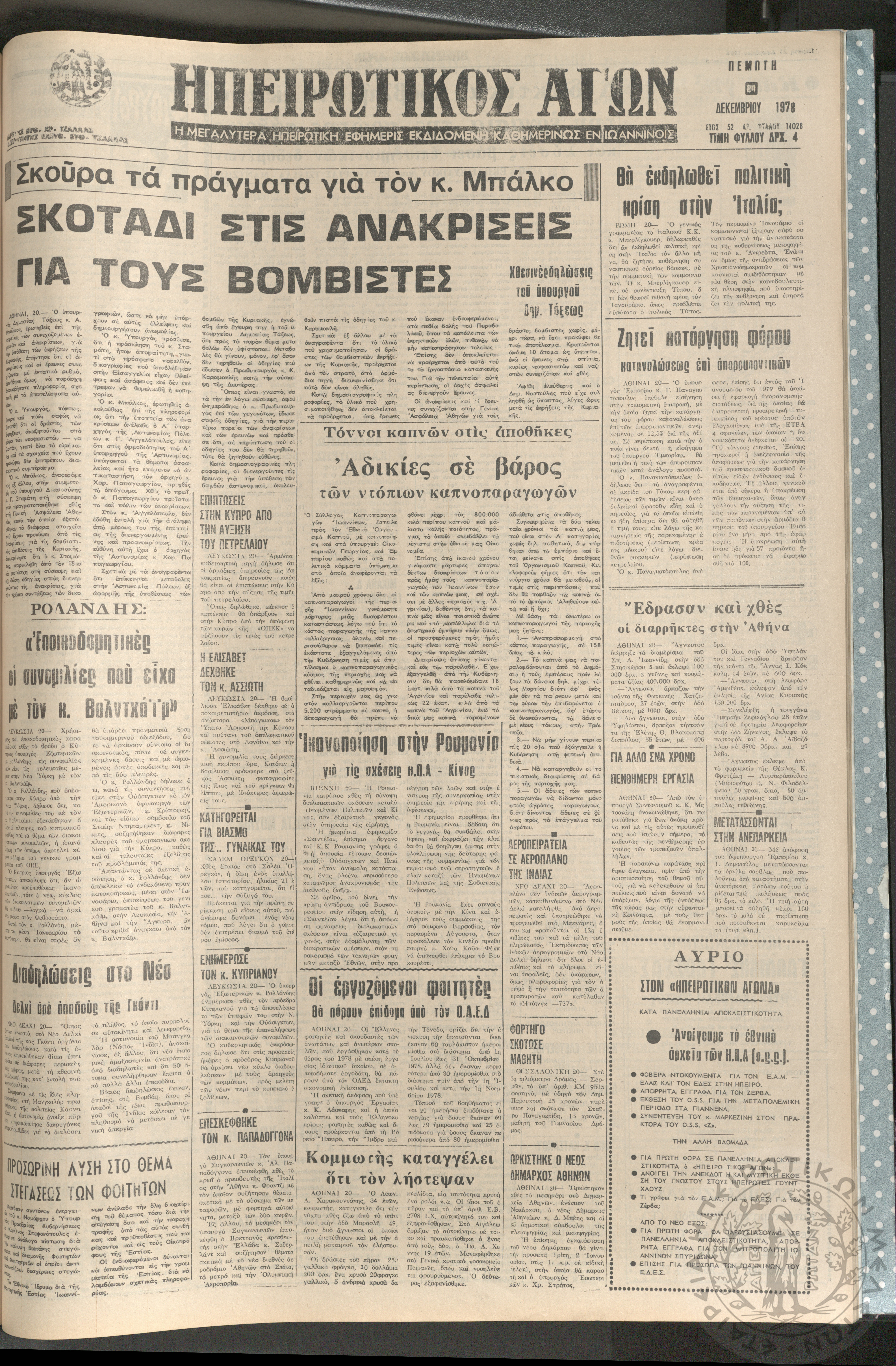 Ηπειρωτικός Αγών: η μεγαλυτέρα ηπειρωτική εφημερίς εκδιδόμενη καθημερινώς εν Ιωαννίνοις, 1978, φ. 14028Έτος 51, φ. 14028...