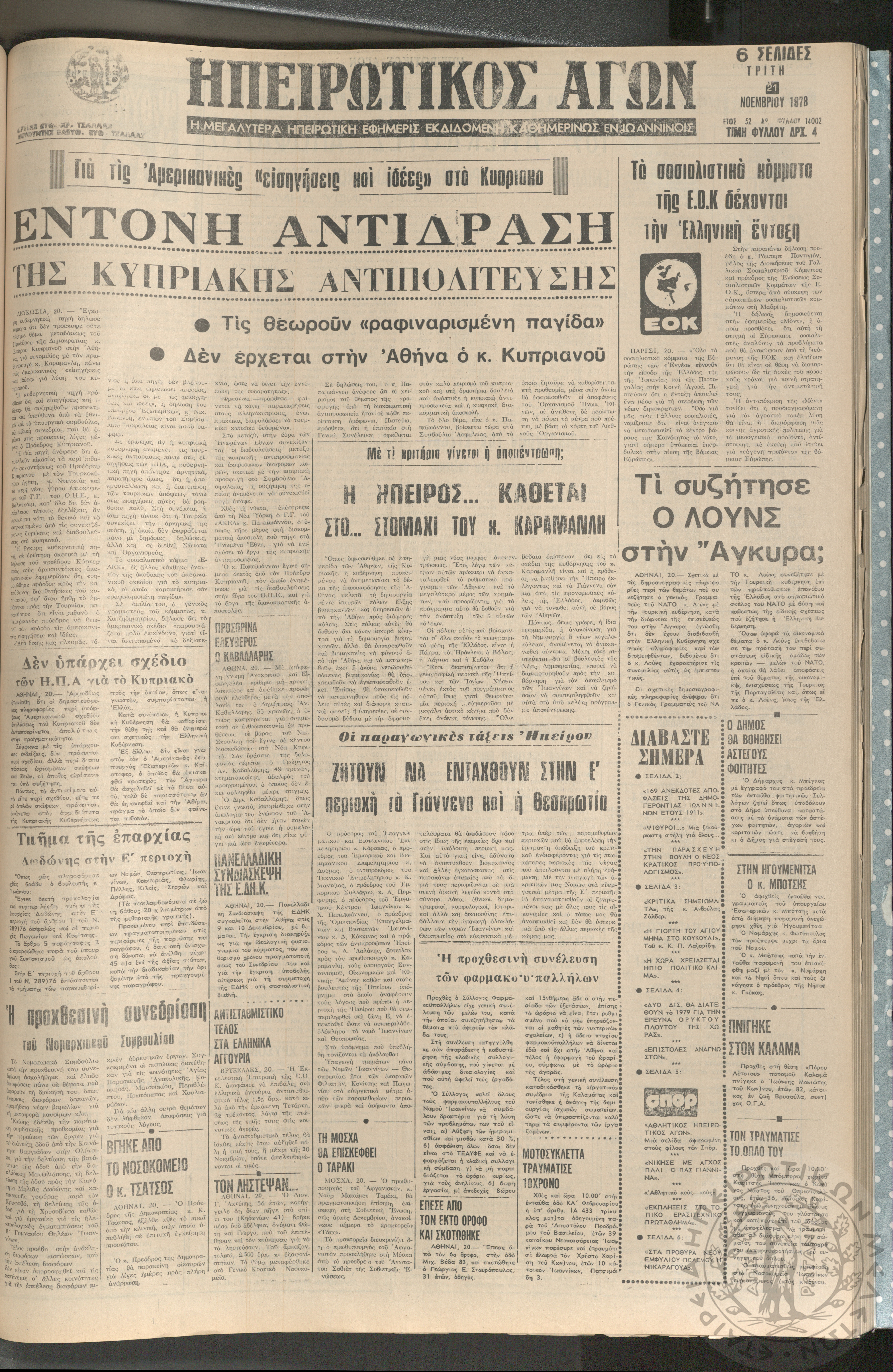 Ηπειρωτικός Αγών: η μεγαλυτέρα ηπειρωτική εφημερίς εκδιδόμενη καθημερινώς εν Ιωαννίνοις, 1978, φ. 14002Έτος 52, φ. 14002...