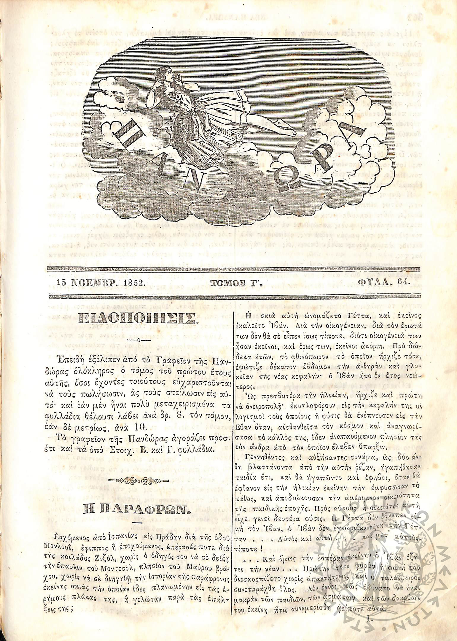 Πανδώρα: σύγγραμμα περιοδικόν εκδιδόμενον δις του μηνός (Τόμ. 3, τεύχ. 64)