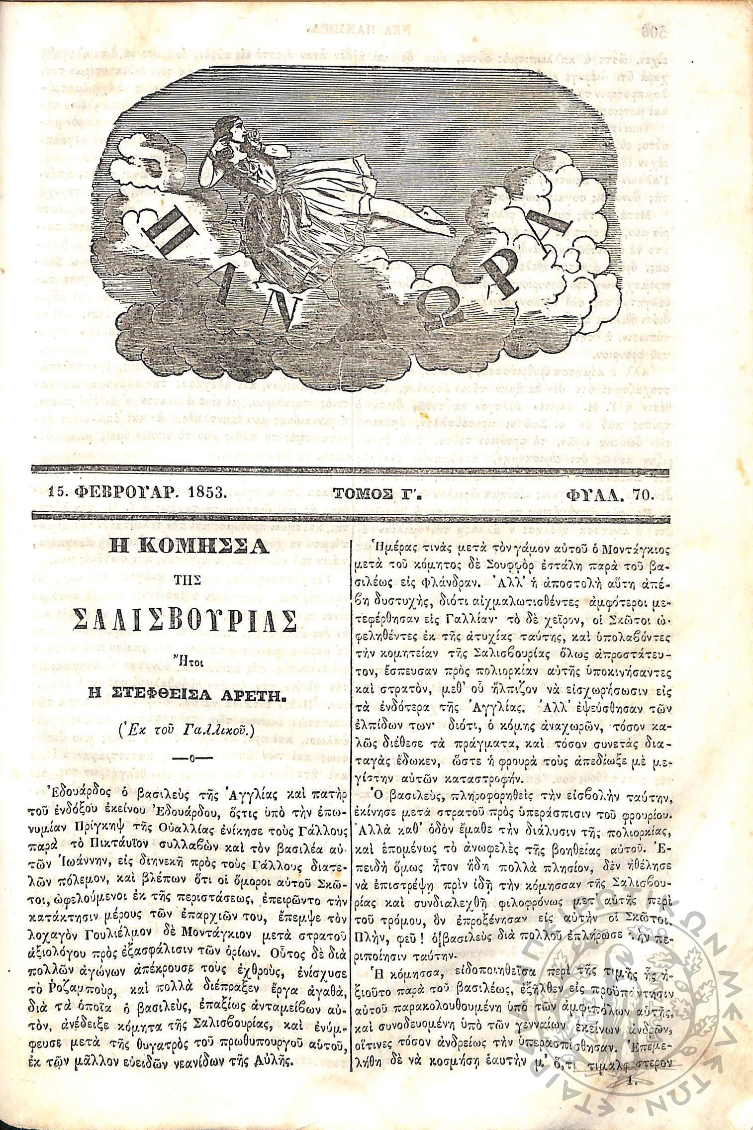 Πανδώρα: σύγγραμμα περιοδικόν εκδιδόμενον δις του μηνός (Τόμ. 3, τεύχ. 70)
