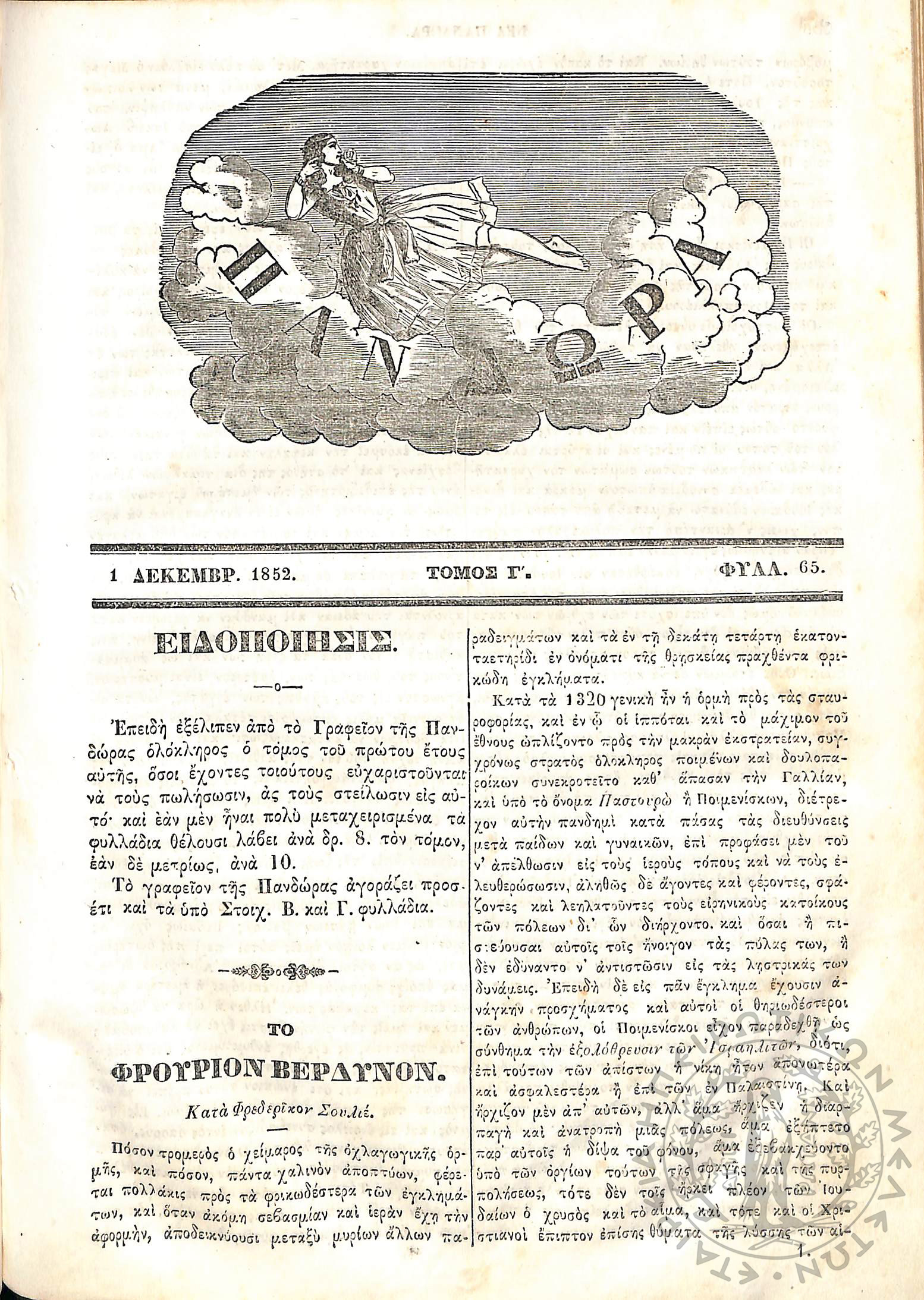 Πανδώρα: σύγγραμμα περιοδικόν εκδιδόμενον δις του μηνός (Τόμ. 3, τεύχ. 65)