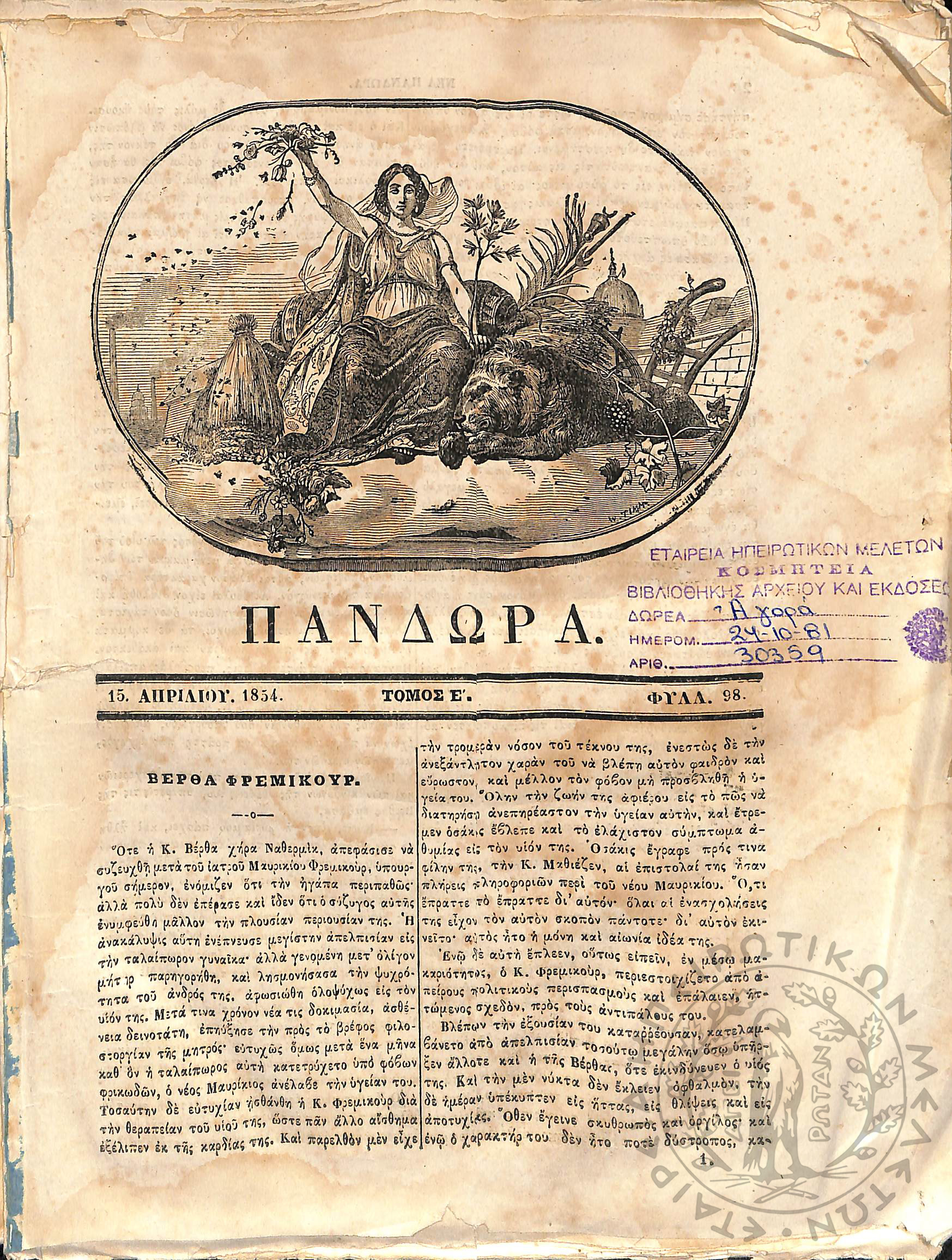 Πανδώρα: σύγγραμμα περιοδικόν εκδιδόμενον δις του μηνός (Τόμ. 5, τεύχ. 98)