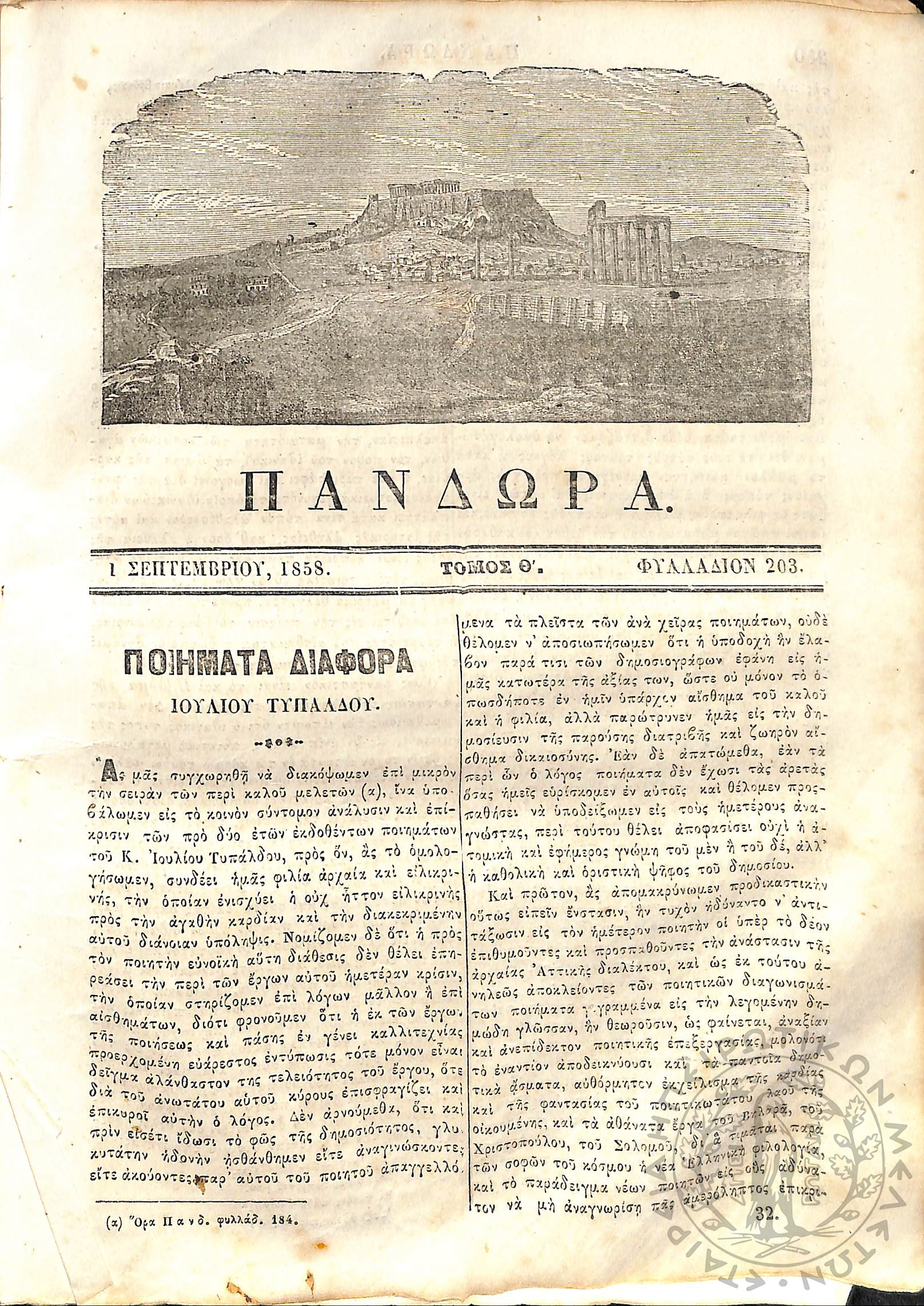 Πανδώρα: σύγγραμμα περιοδικόν εκδιδόμενον δις του μηνός (Τόμ. 9, τεύχ. 203)