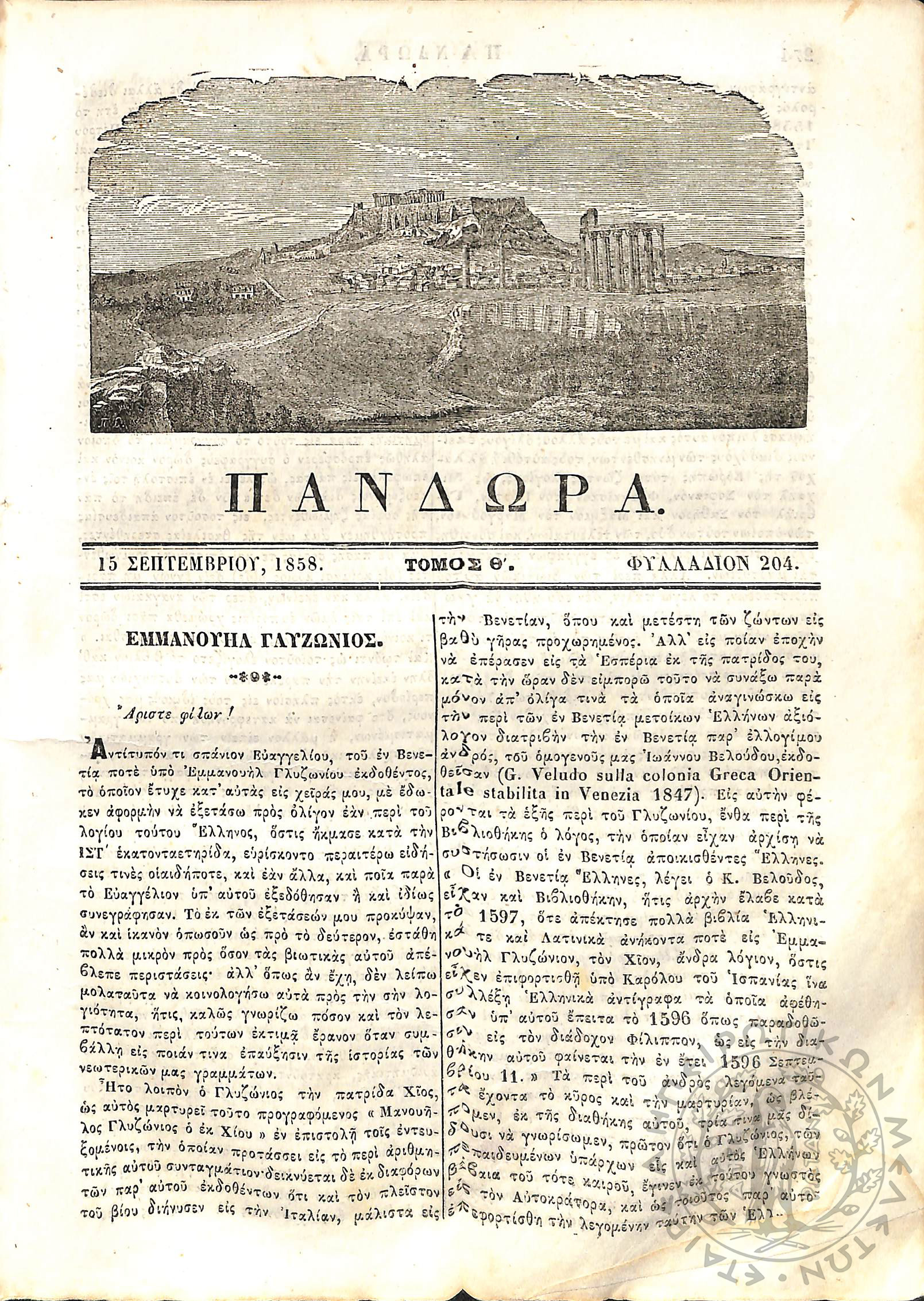 Πανδώρα: σύγγραμμα περιοδικόν εκδιδόμενον δις του μηνός (Τόμ. 9, τεύχ. 204)