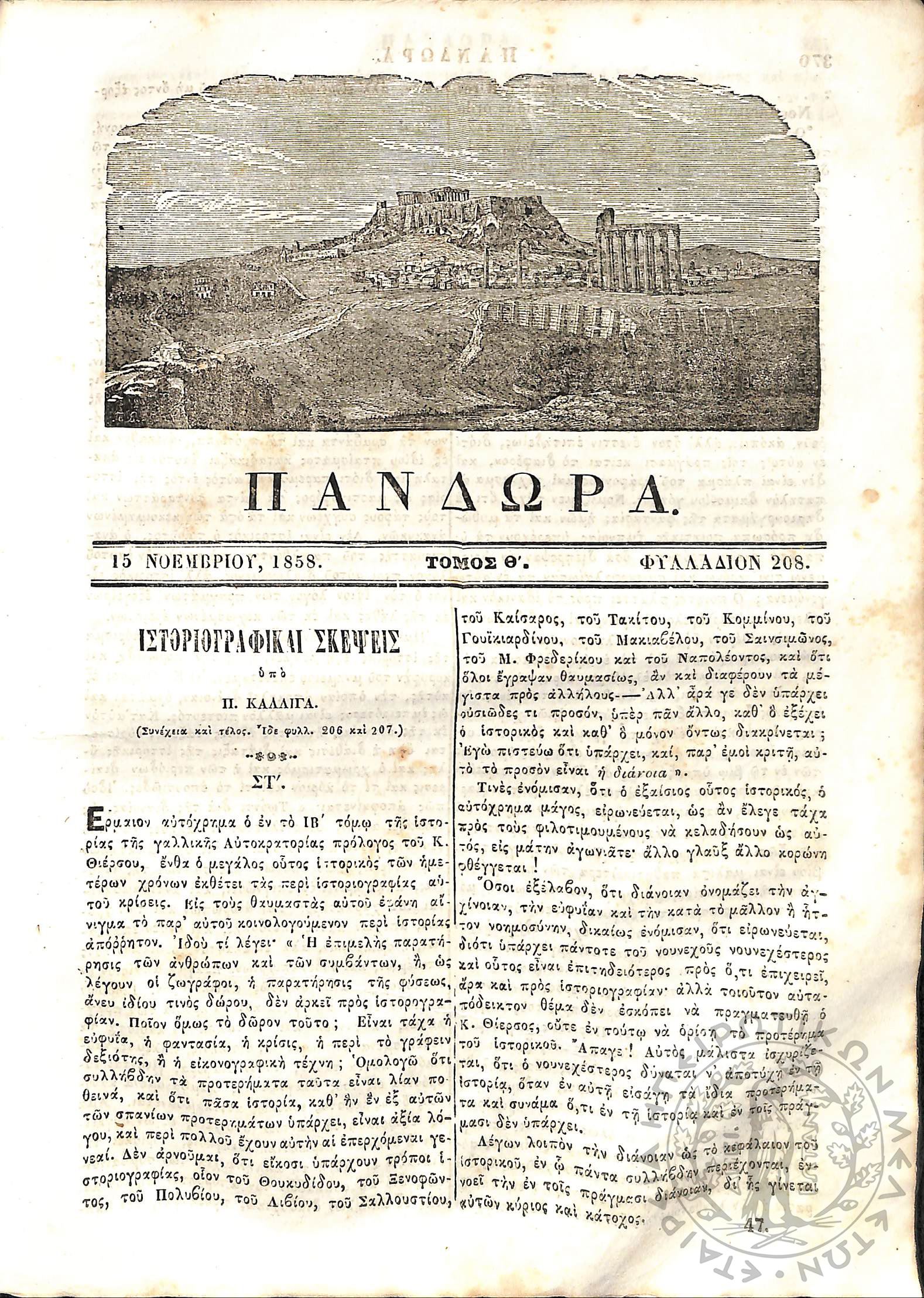 Πανδώρα: σύγγραμμα περιοδικόν εκδιδόμενον δις του μηνός (Τόμ. 9, τεύχ. 208)