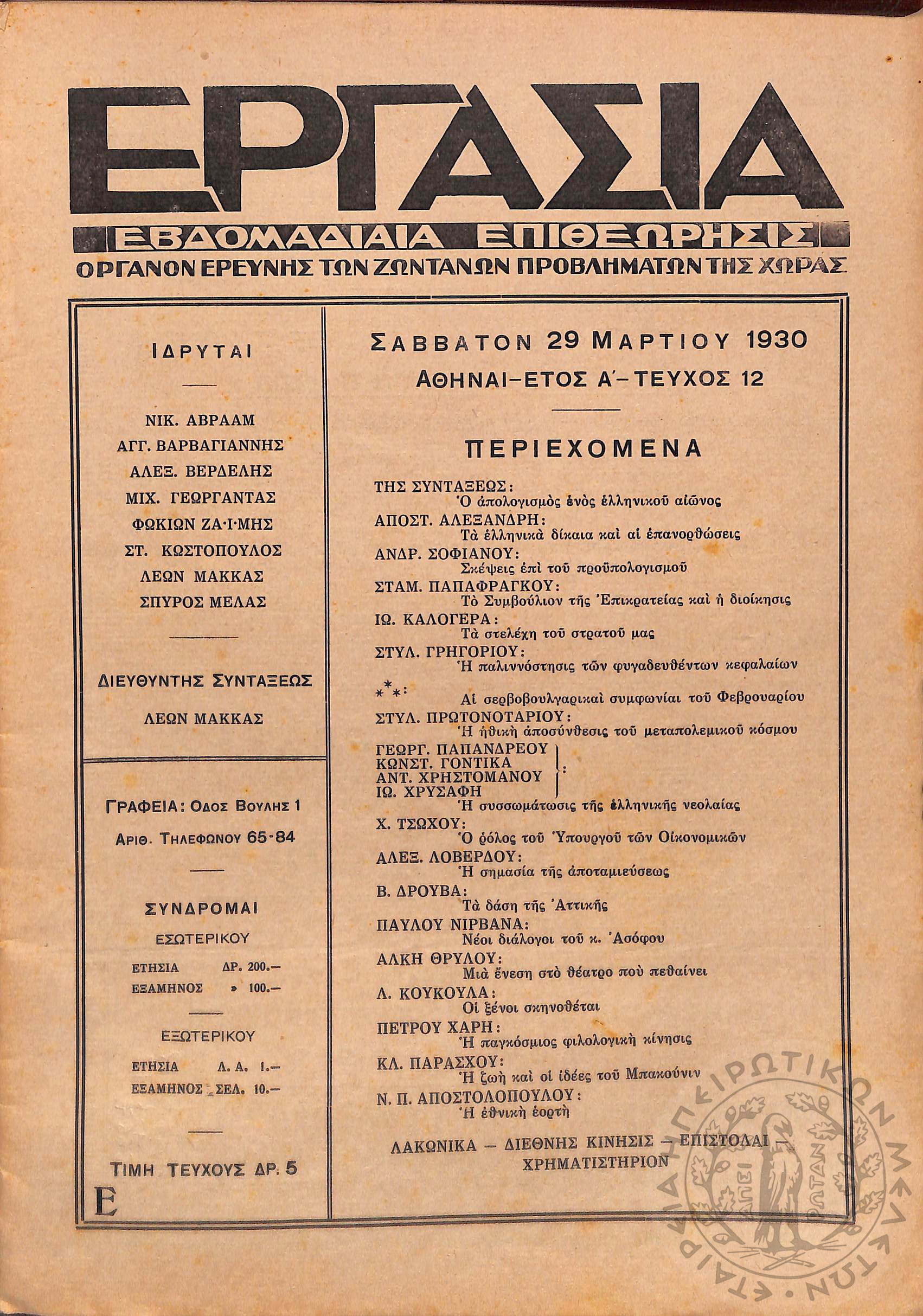 Εργασία: εβδομαδιαία επιθεώρησις όργανον ερεύνης των ζωντανών προβλημάτων της χώρας (τεύχ. 12)Έτος Α΄, τεύχ. 12...