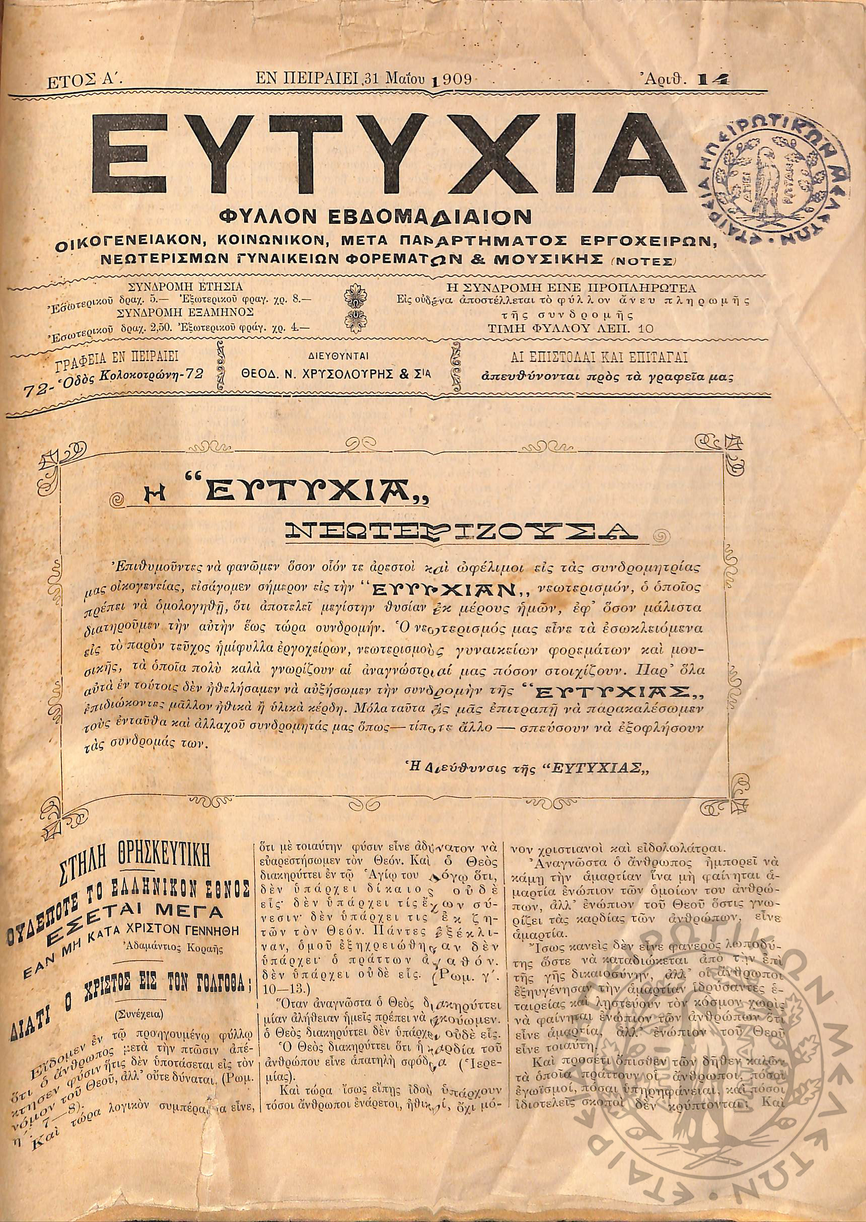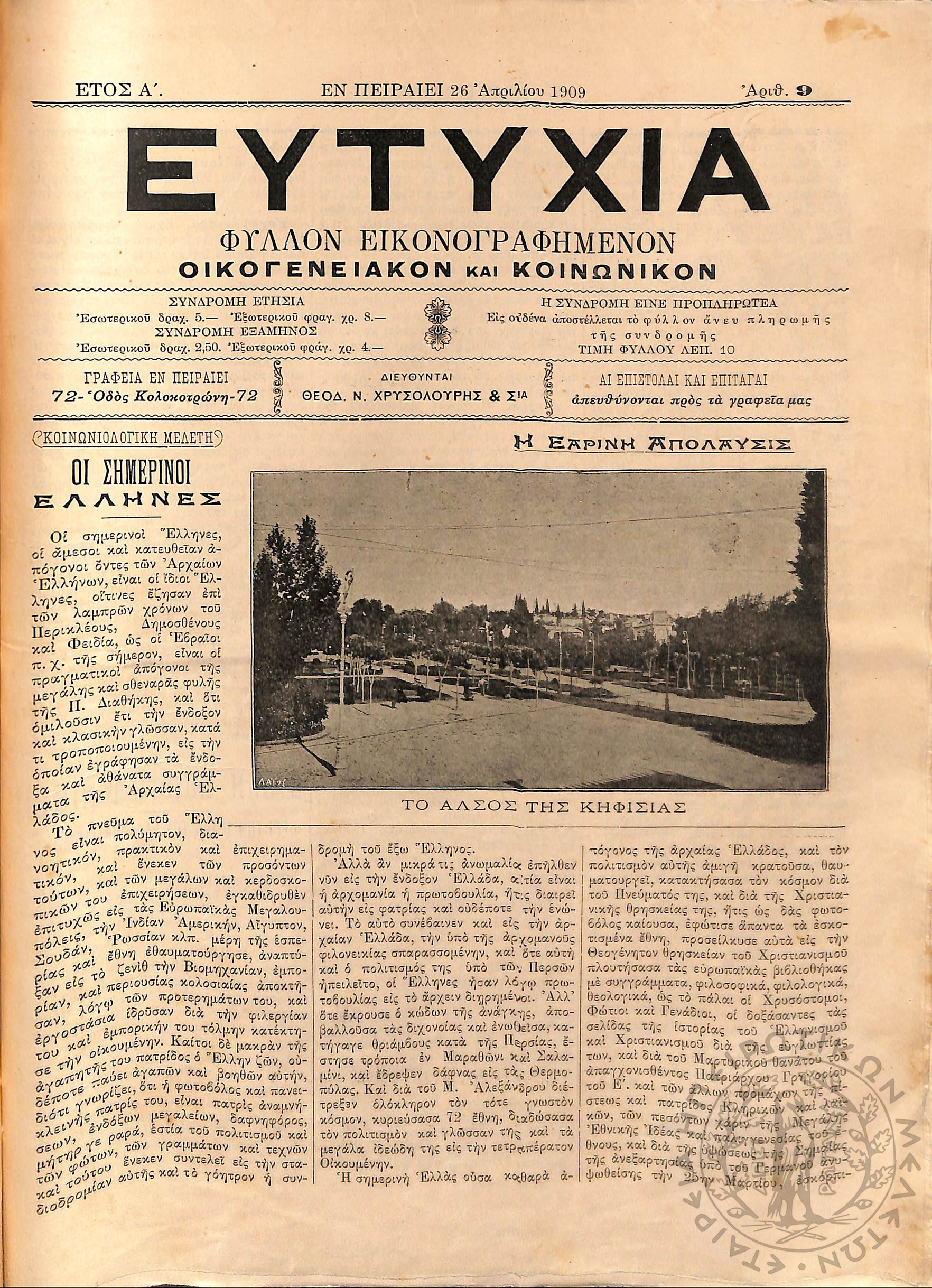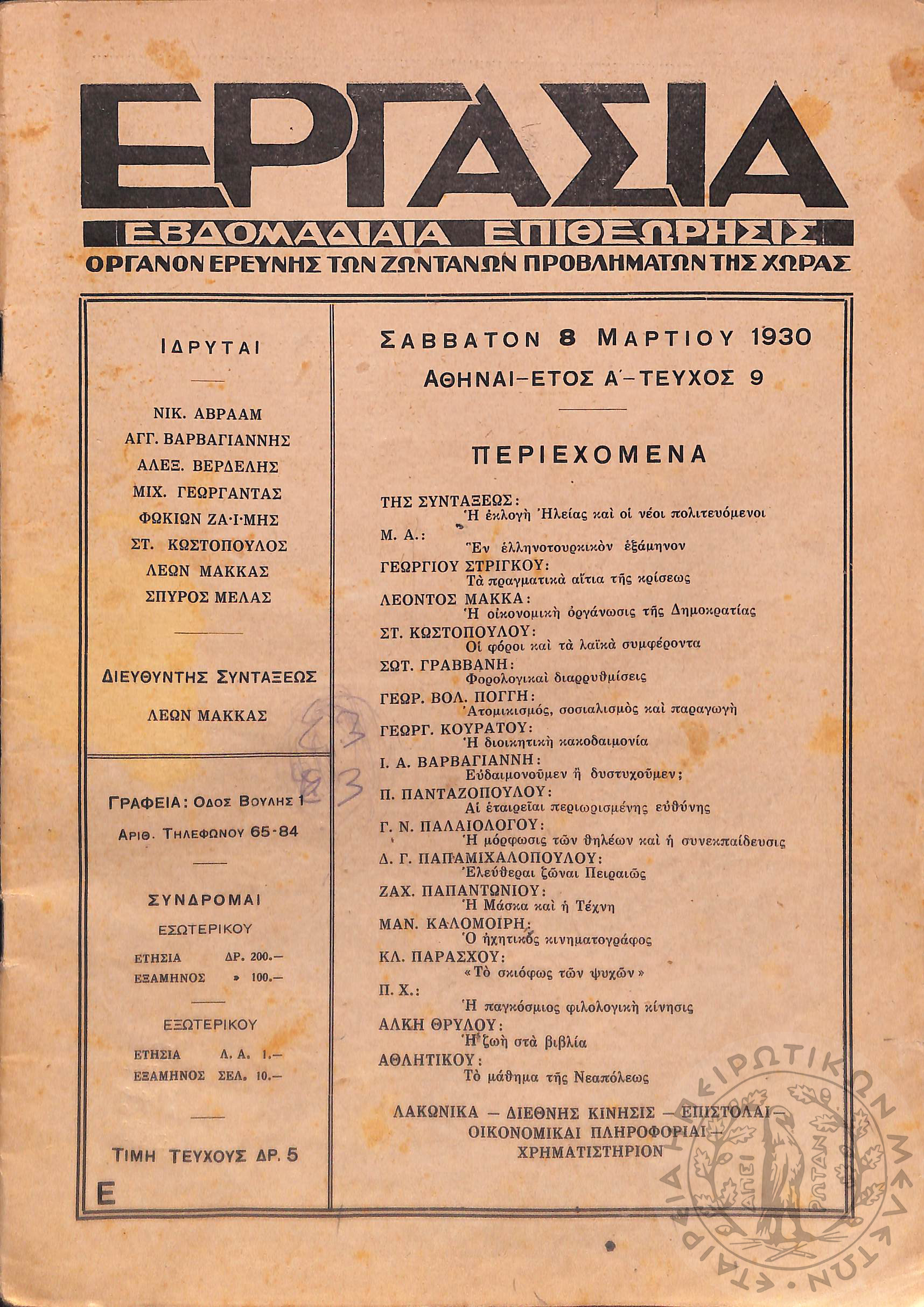 Εργασία: εβδομαδιαία επιθεώρησις όργανον ερεύνης των ζωντανών προβλημάτων της χώρας (τεύχ. 9)Έτος Α΄, τεύχ. 9...