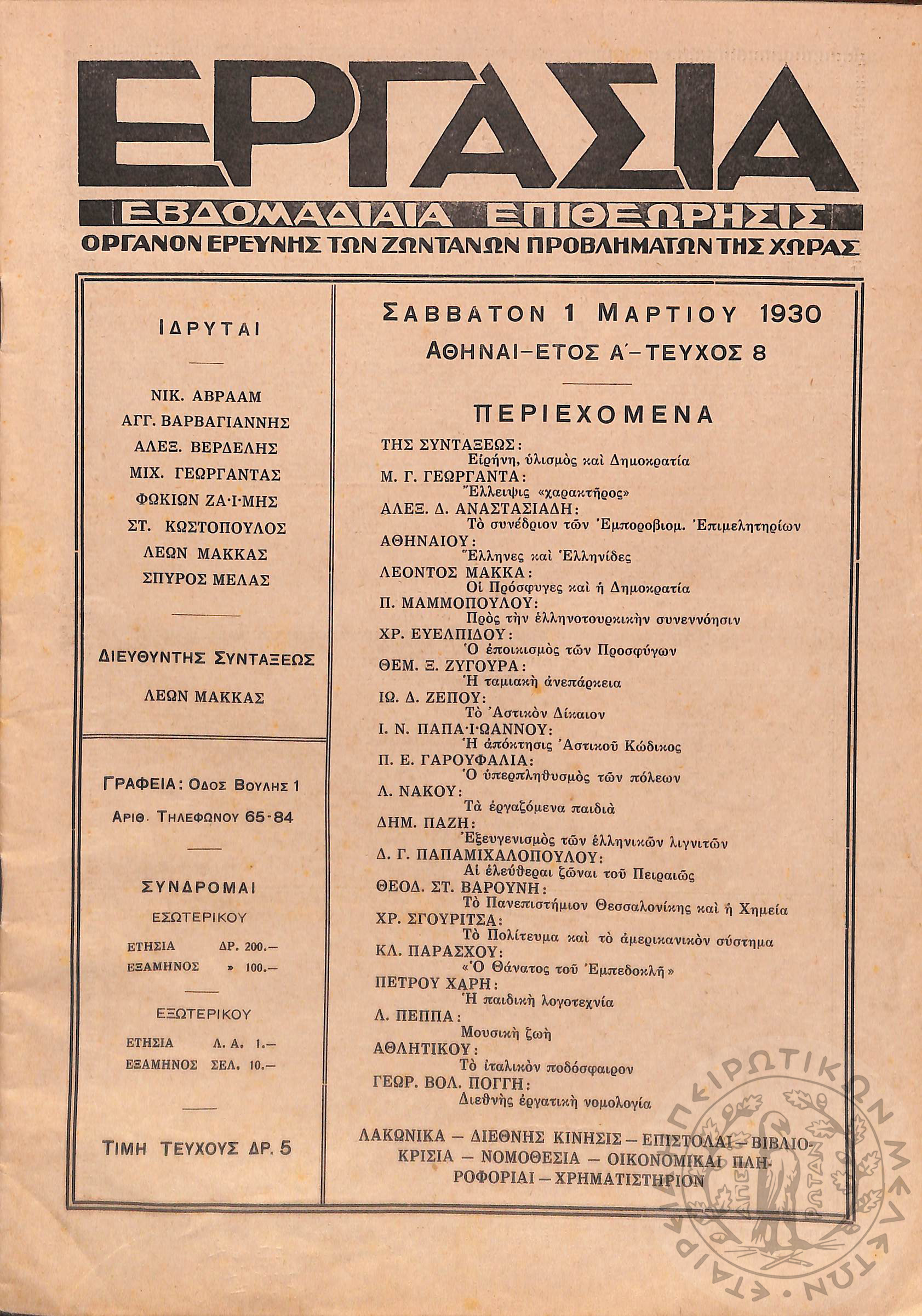 Εργασία: εβδομαδιαία επιθεώρησις όργανον ερεύνης των ζωντανών προβλημάτων της χώρας (τεύχ. 8)Έτος Α΄, τεύχ. 8...
