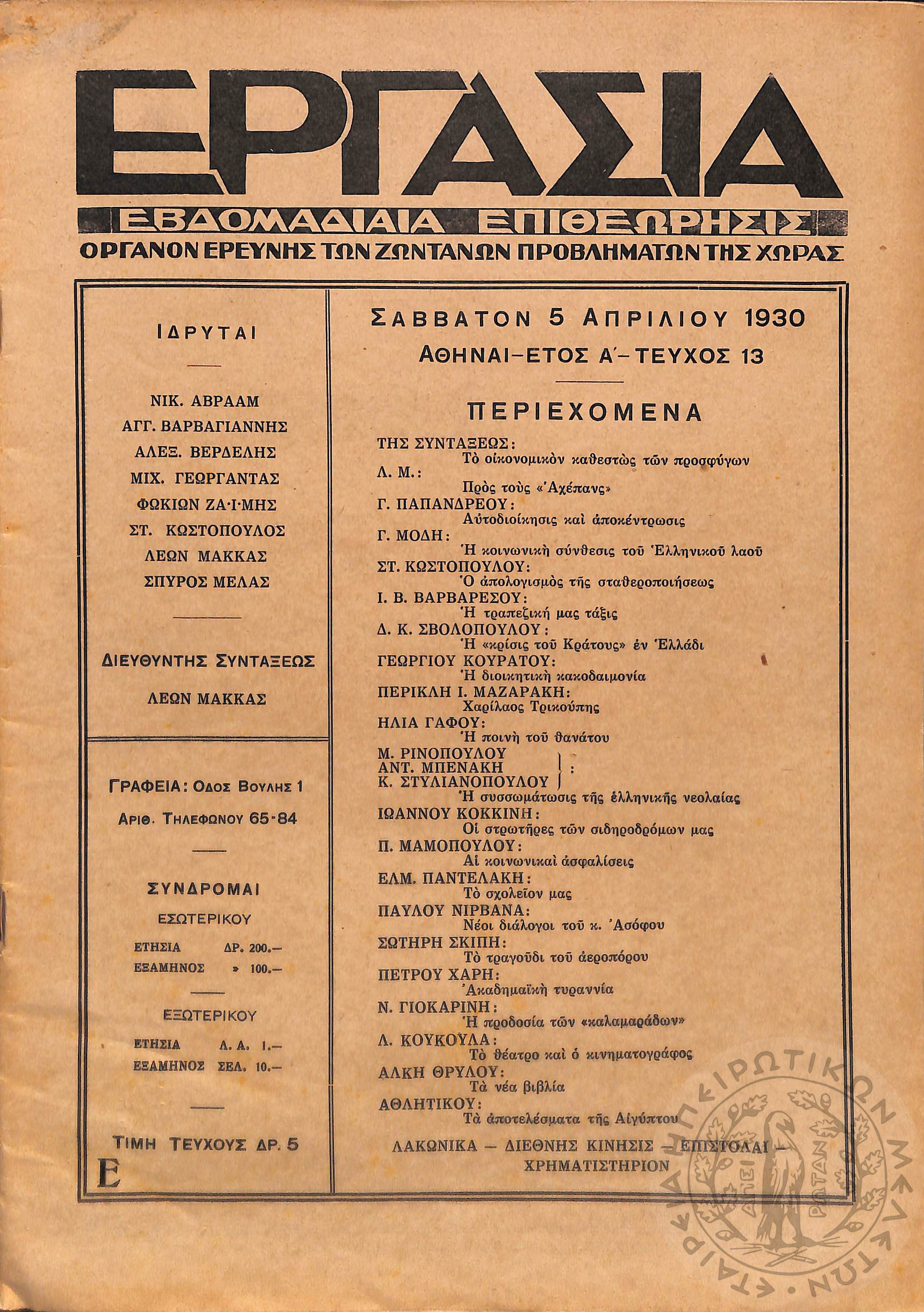 Εργασία: εβδομαδιαία επιθεώρησις όργανον ερεύνης των ζωντανών προβλημάτων της χώρας (τεύχ. 13)Έτος Α΄, τεύχ. 13...