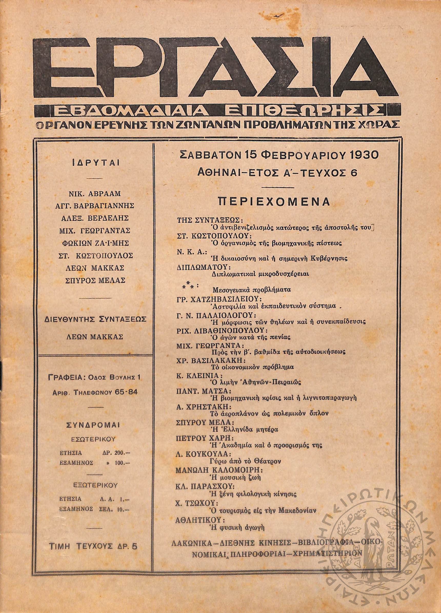 Εργασία: εβδομαδιαία επιθεώρησις όργανον ερεύνης των ζωντανών προβλημάτων της χώρας (τεύχ. 6)Έτος Α΄, τεύχ. 6...