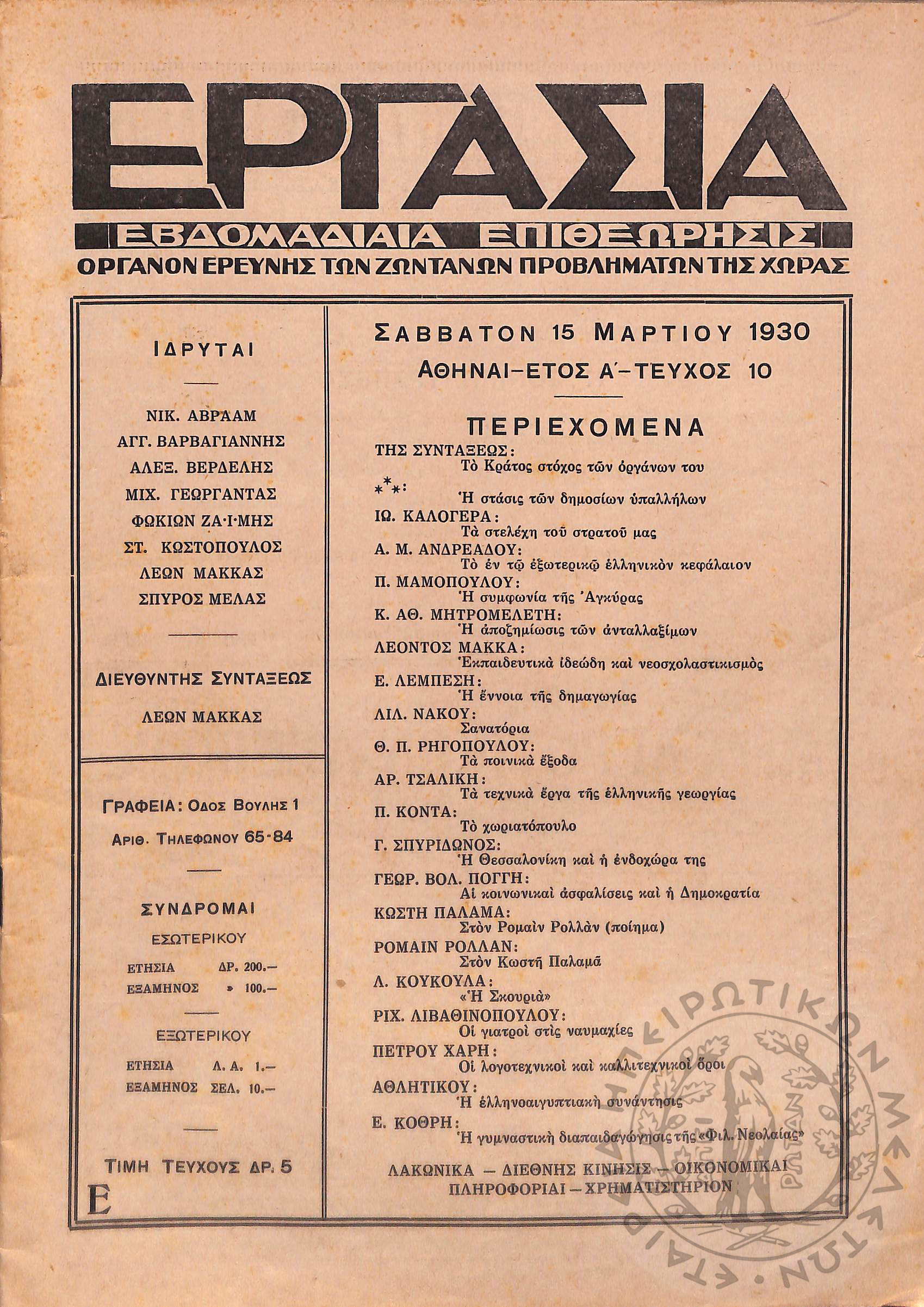 Εργασία: εβδομαδιαία επιθεώρησις όργανον ερεύνης των ζωντανών προβλημάτων της χώρας (τεύχ. 10)Έτος Α΄, τεύχ. 10...