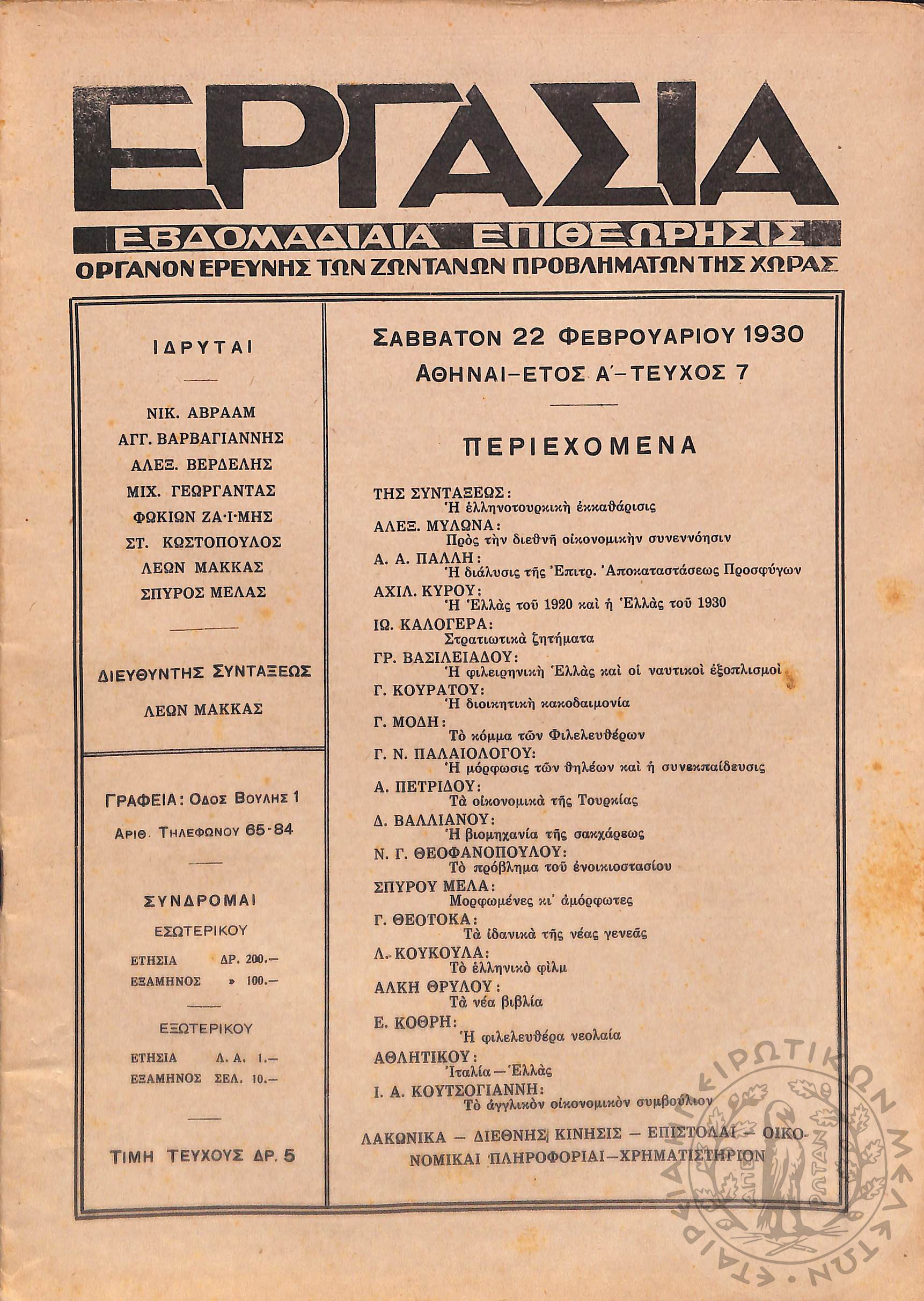 Εργασία: εβδομαδιαία επιθεώρησις όργανον ερεύνης των ζωντανών προβλημάτων της χώρας (τεύχ. 7)Έτος Α΄, τεύχ. 7...