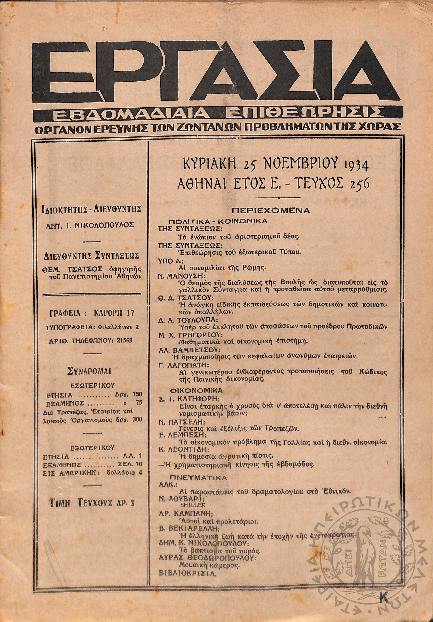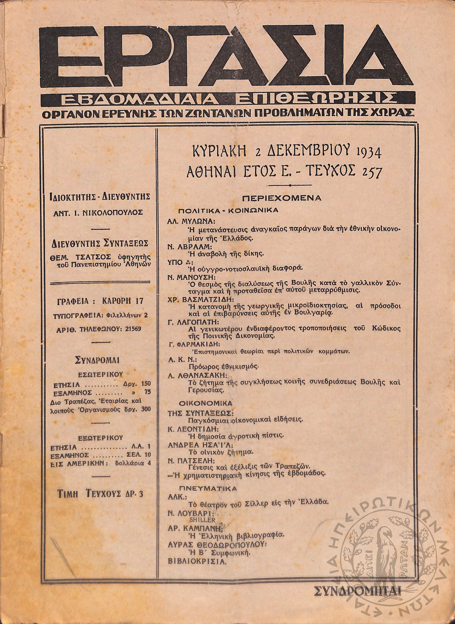 Εργασία: εβδομαδιαία επιθεώρησις όργανον ερεύνης των ζωντανών προβλημάτων της χώρας (τεύχ. 256)Έτος Ε΄, τεύχ. 256...