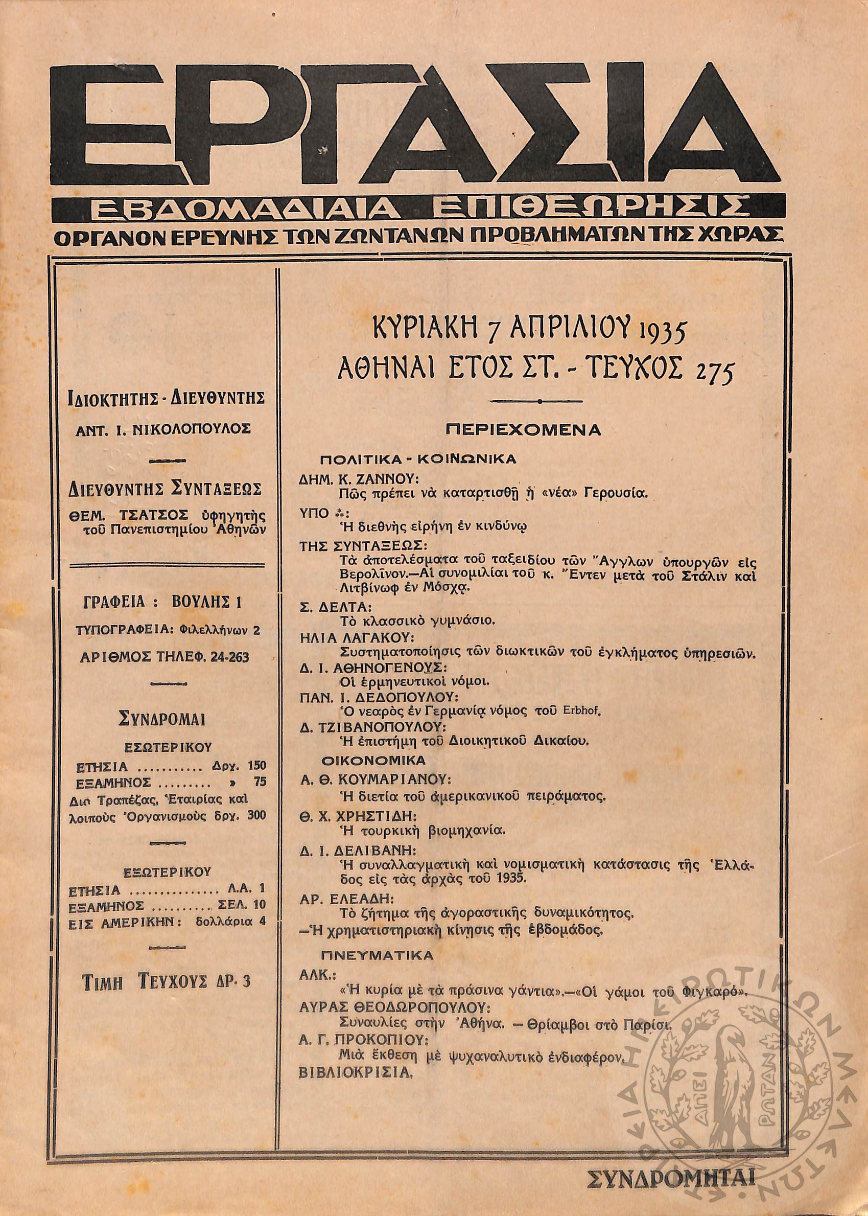 Εργασία: εβδομαδιαία επιθεώρησις όργανον ερεύνης των ζωντανών προβλημάτων της χώρας (τεύχ. 275)Έτος ΣΤ΄, τεύχ. 275...