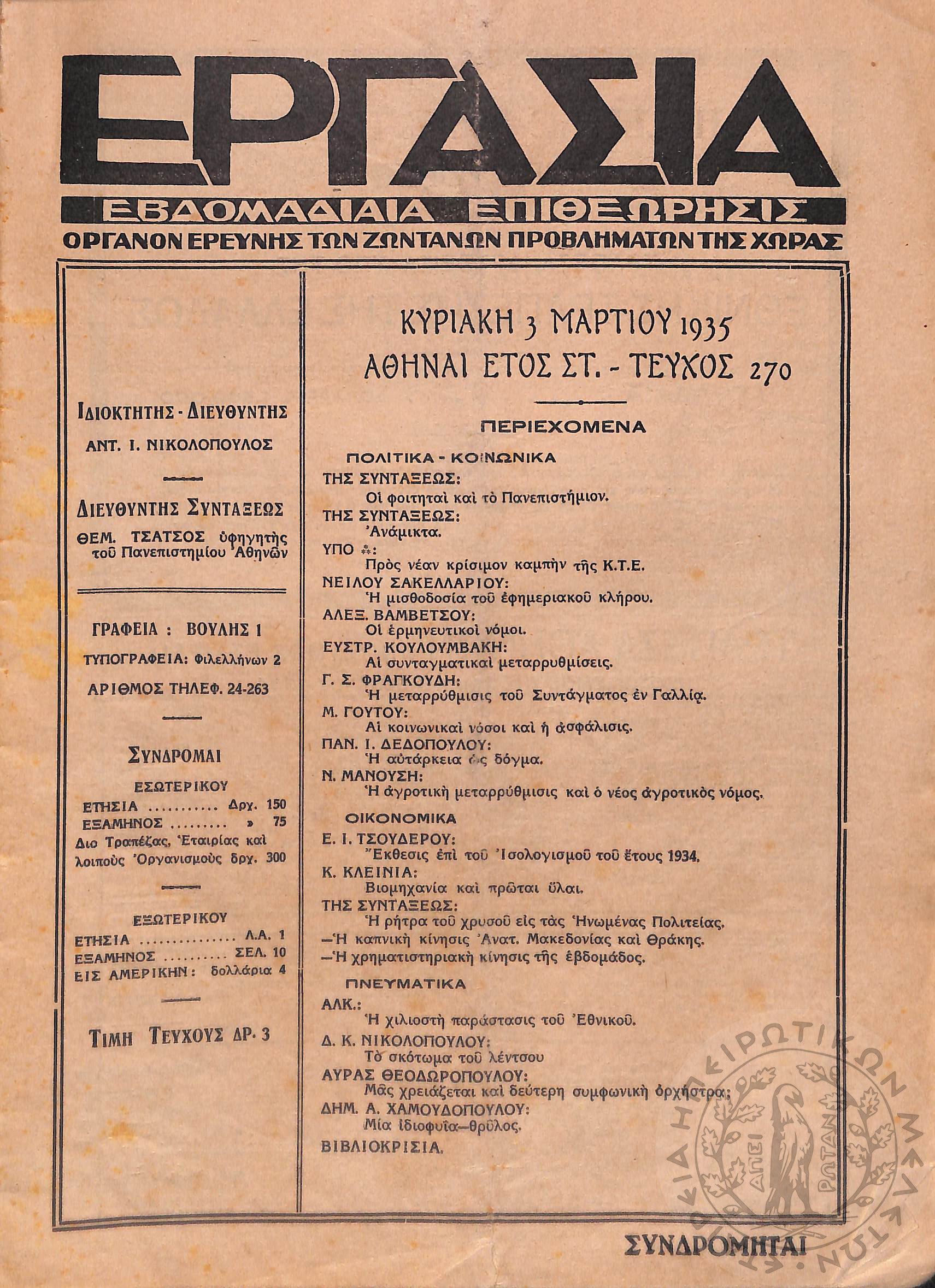Εργασία: εβδομαδιαία επιθεώρησις όργανον ερεύνης των ζωντανών προβλημάτων της χώρας (τεύχ. 270)Έτος ΣΤ΄, τεύχ. 270...