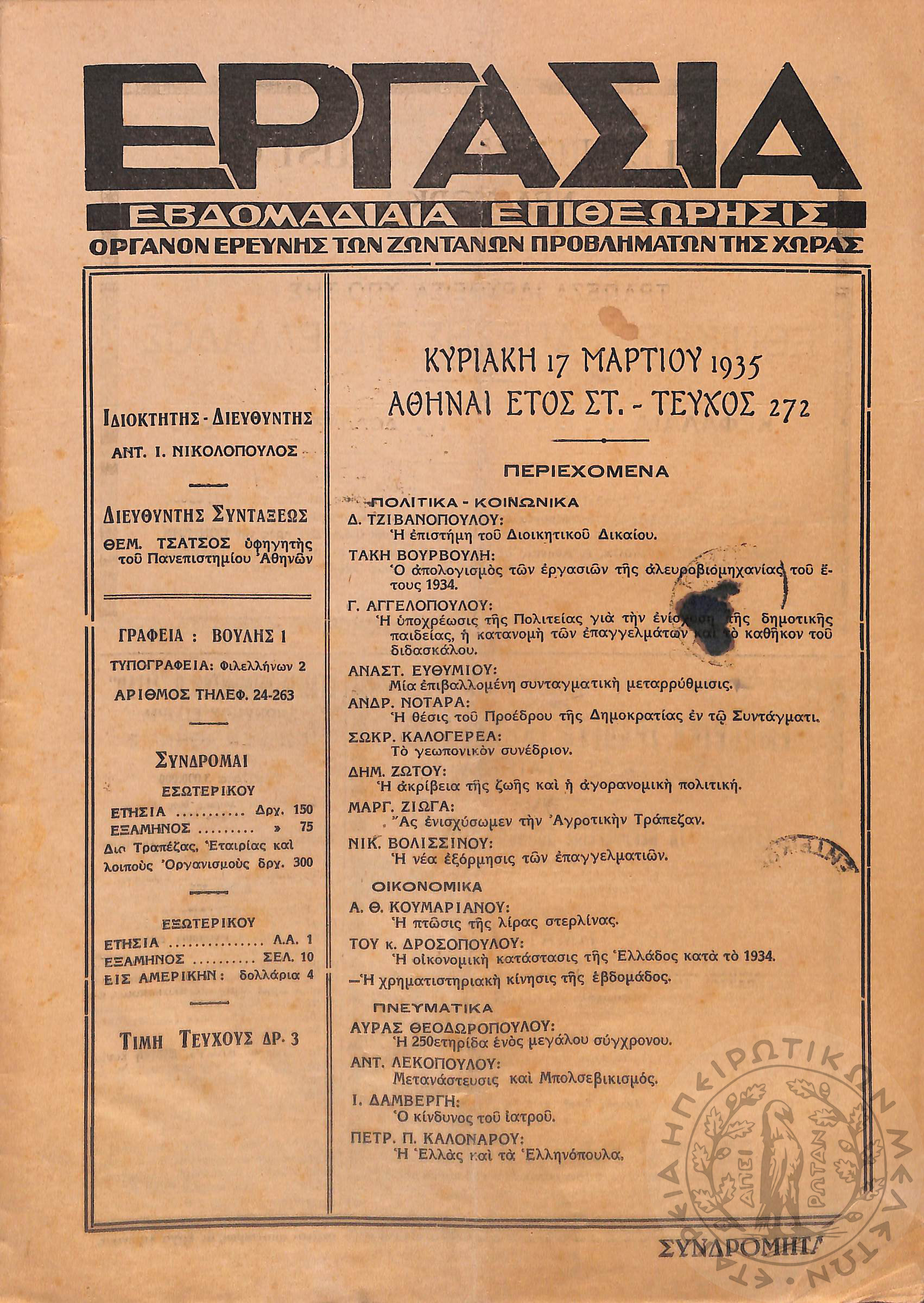 Εργασία: εβδομαδιαία επιθεώρησις όργανον ερεύνης των ζωντανών προβλημάτων της χώρας (τεύχ. 272)Έτος ΣΤ΄, τεύχ. 272...