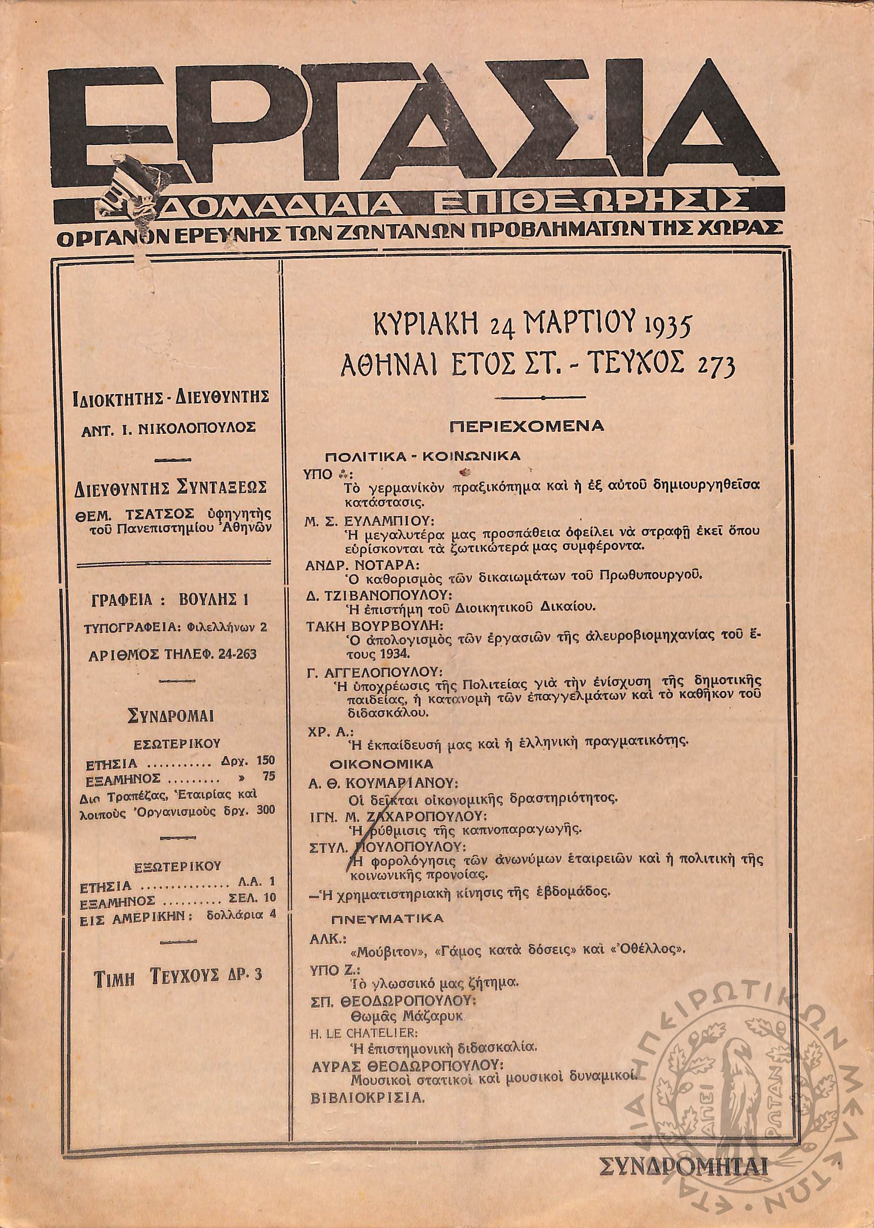 Εργασία: εβδομαδιαία επιθεώρησις όργανον ερεύνης των ζωντανών προβλημάτων της χώρας (τεύχ. 273)Έτος ΣΤ΄, τεύχ. 273...