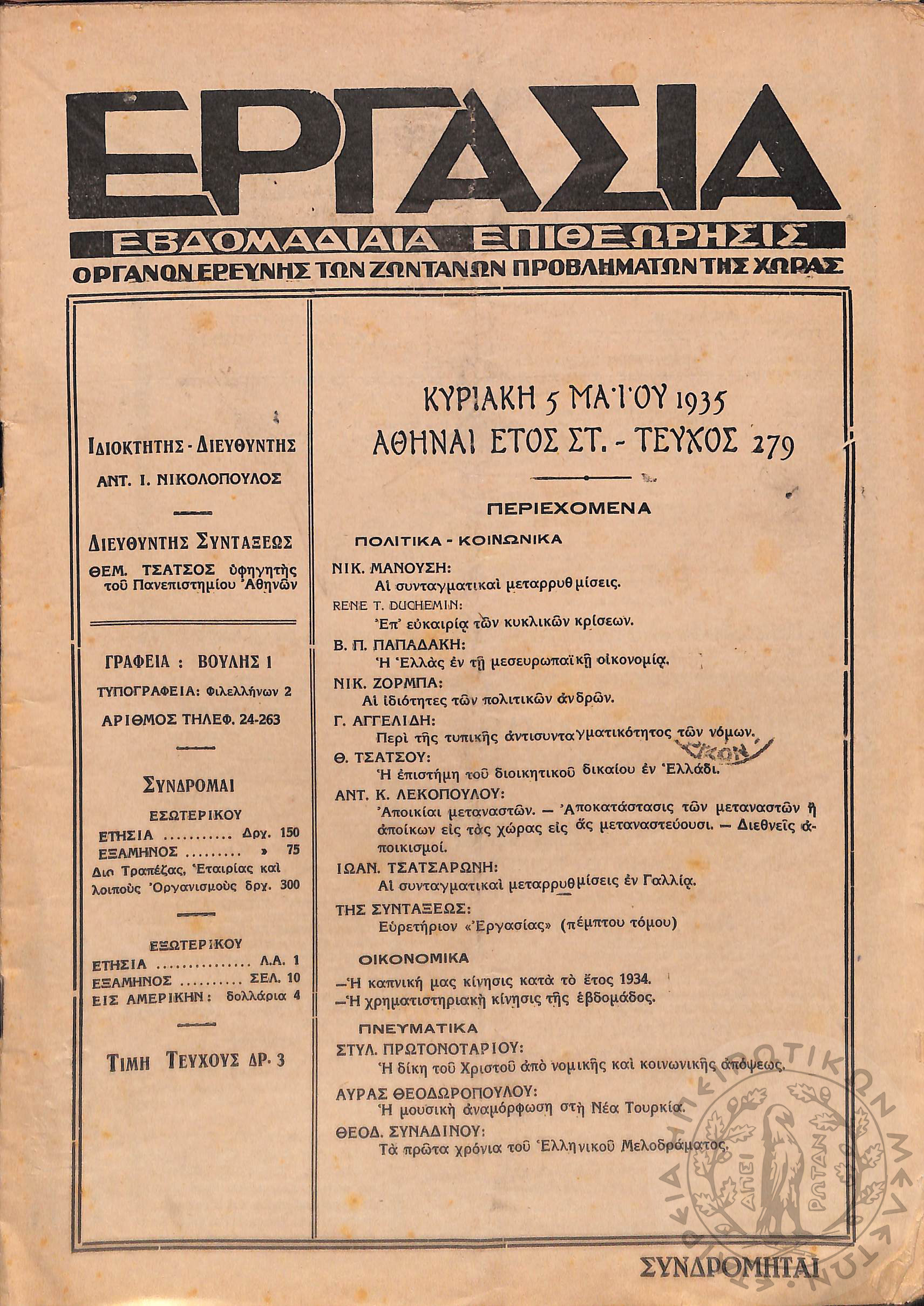 Εργασία: εβδομαδιαία επιθεώρησις όργανον ερεύνης των ζωντανών προβλημάτων της χώρας (τεύχ. 279)Έτος ΣΤ΄, τεύχ. 279...