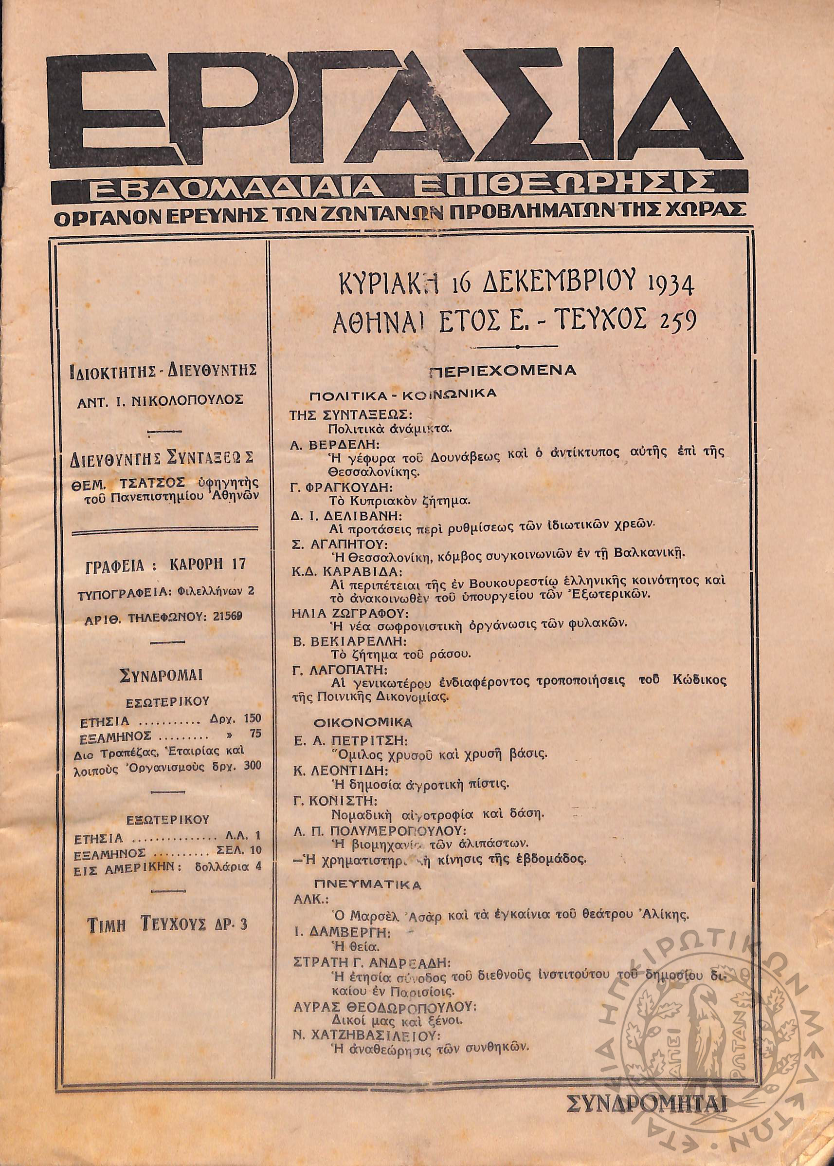 Εργασία: εβδομαδιαία επιθεώρησις όργανον ερεύνης των ζωντανών προβλημάτων της χώρας (τεύχ. 259)Έτος Ε΄, τεύχ. 259...