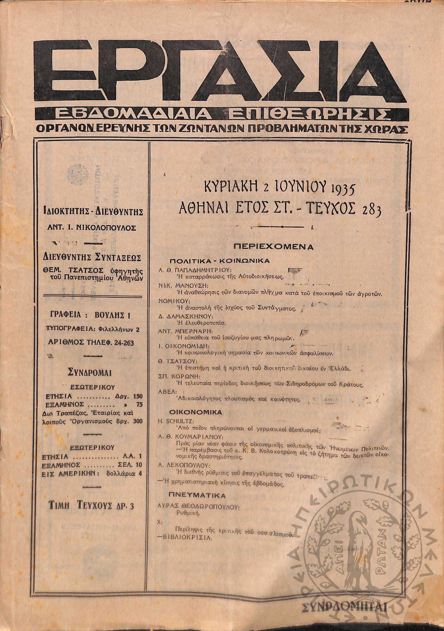 Εργασία: εβδομαδιαία επιθεώρησις όργανον ερεύνης των ζωντανών προβλημάτων της χώρας (τεύχ. 283)Έτος ΣΤ΄, τεύχ. 283...