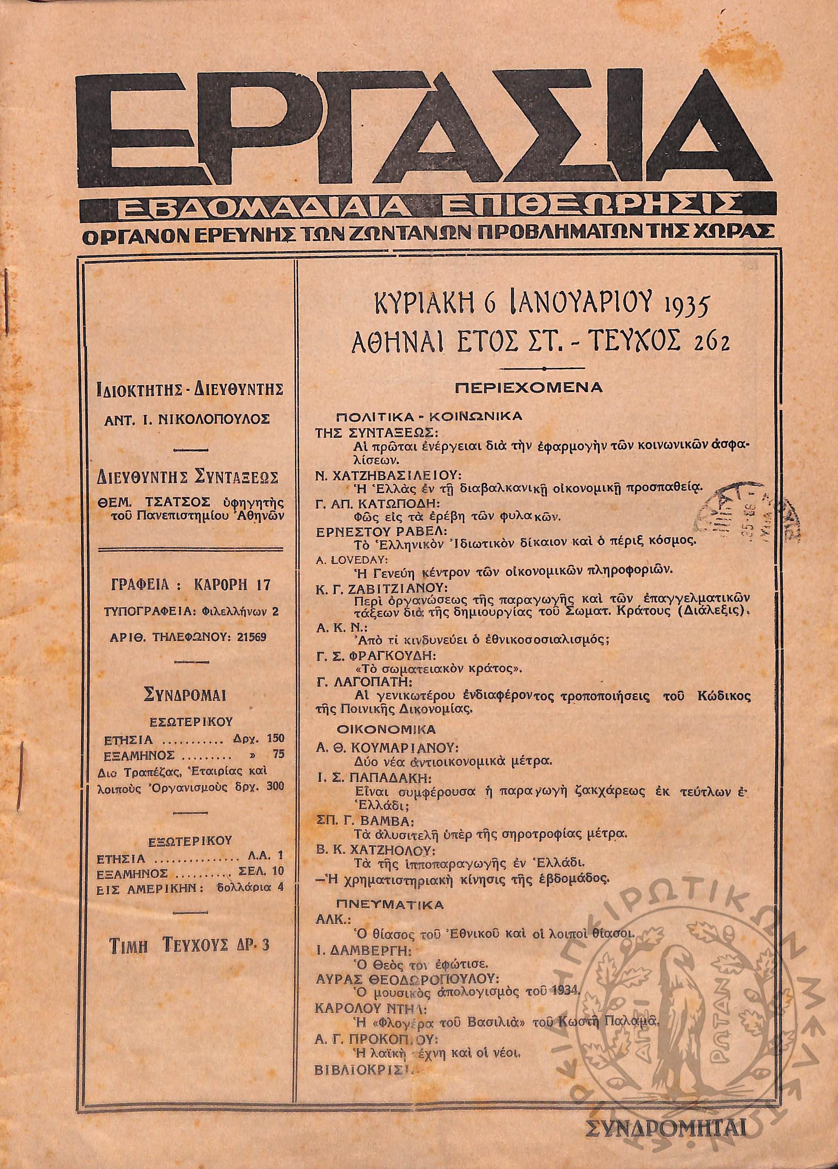 Εργασία: εβδομαδιαία επιθεώρησις όργανον ερεύνης των ζωντανών προβλημάτων της χώρας (τεύχ. 262)Έτος Ε΄, τεύχ. 262...