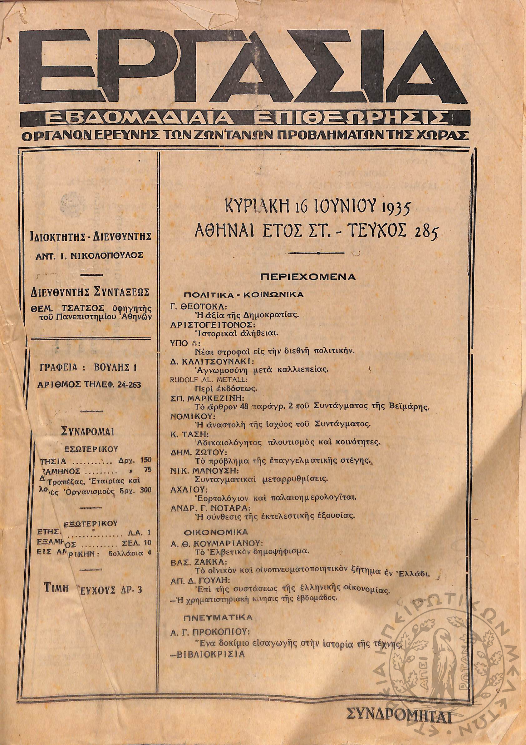 Εργασία: εβδομαδιαία επιθεώρησις όργανον ερεύνης των ζωντανών προβλημάτων της χώρας (τεύχ. 285)Έτος ΣΤ΄, τεύχ. 285...