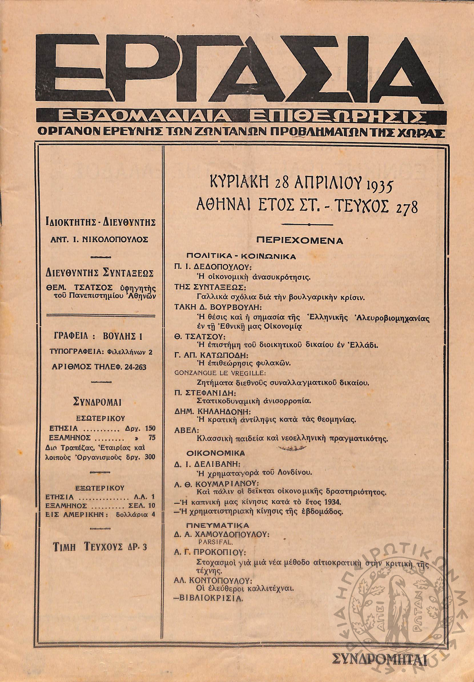 Εργασία: εβδομαδιαία επιθεώρησις όργανον ερεύνης των ζωντανών προβλημάτων της χώρας (τεύχ. 278)Έτος ΣΤ΄, τεύχ. 278...
