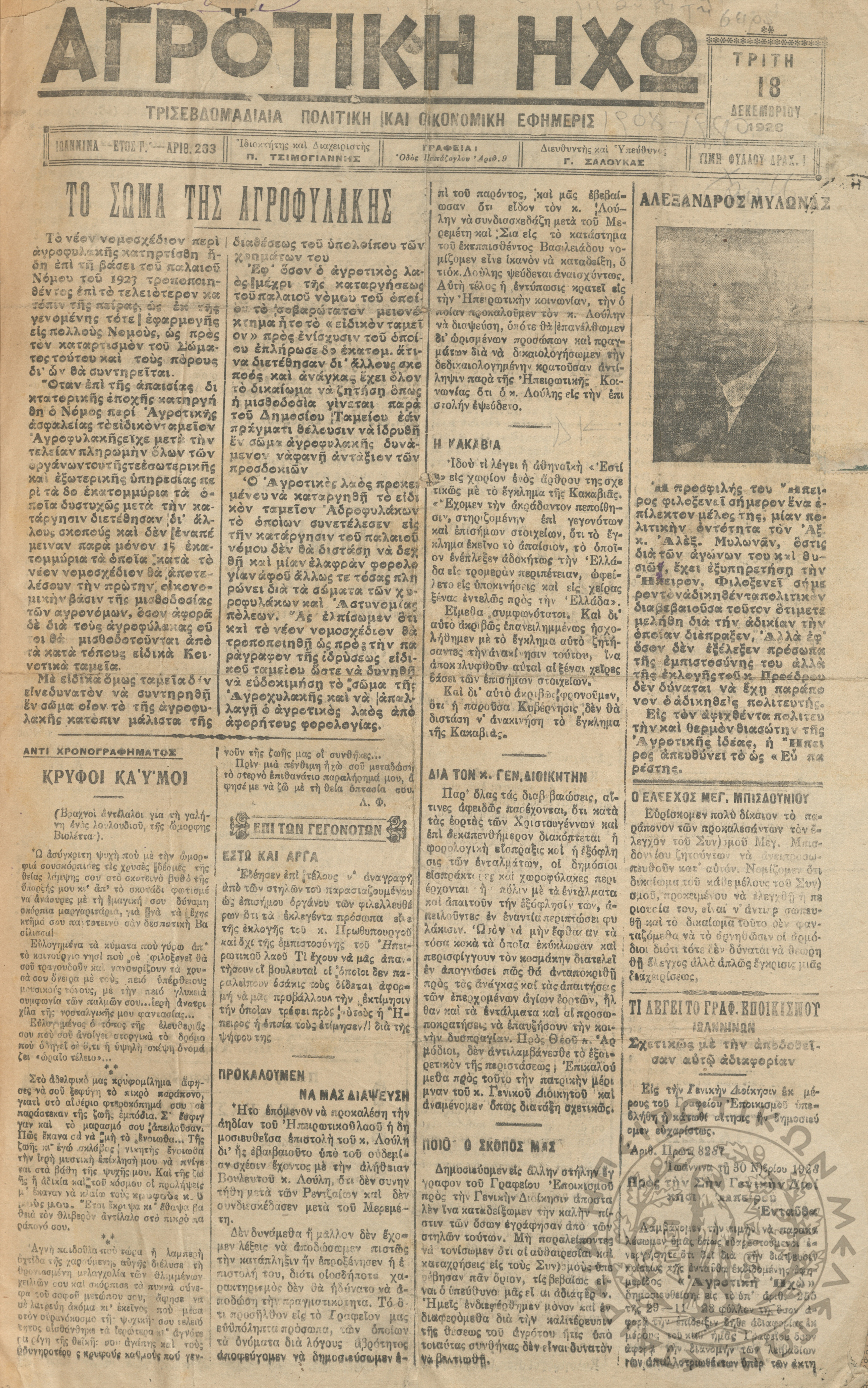 Αγροτική ηχώ: τρισεβδομαδιαία πολιτική και οικονομική εφημερίς, 1928, φ. 233
