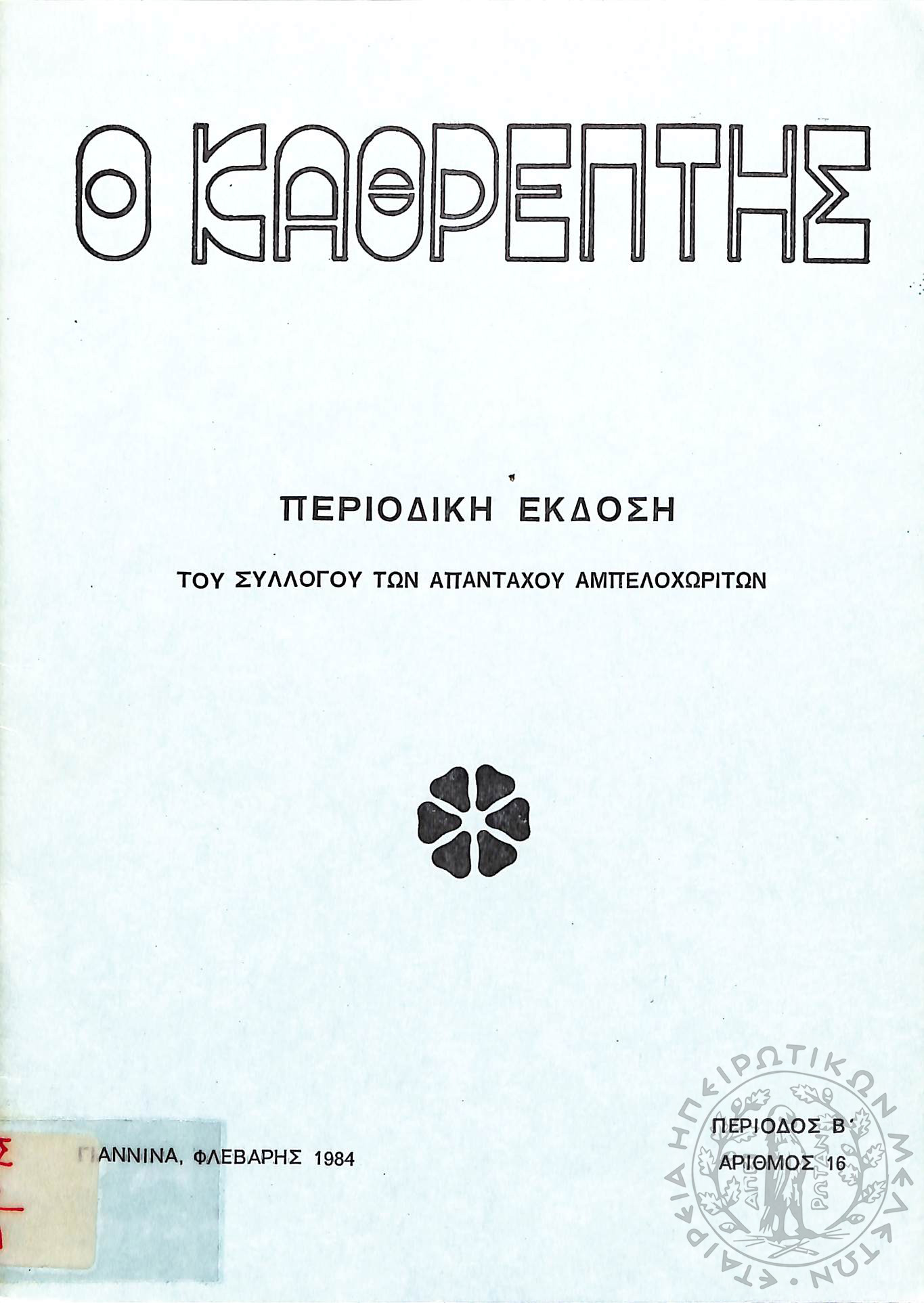 Ο Καθρέφτης: περιοδική έκδοση του συλλόγου των απανταχού Αμπελοχωριτών (τεύχ. 16)Περίοδος Β΄, τεύχ. 16...