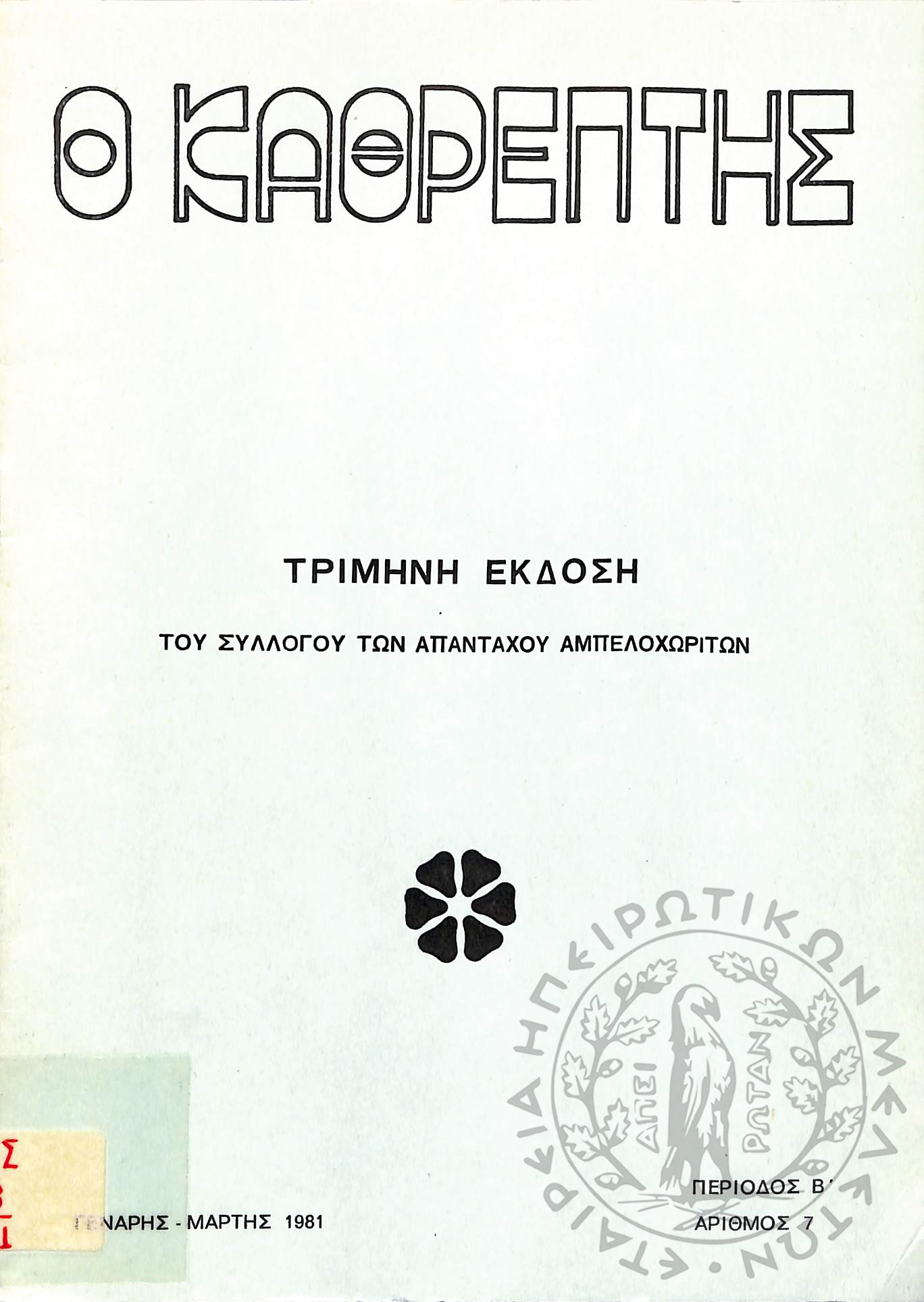 Ο Καθρέφτης: τρίμηνη έκδοση του συλλόγου των απανταχού Αμπελοχωριτών (τεύχ. 7)Περίοδος Β΄, τεύχ. 7...