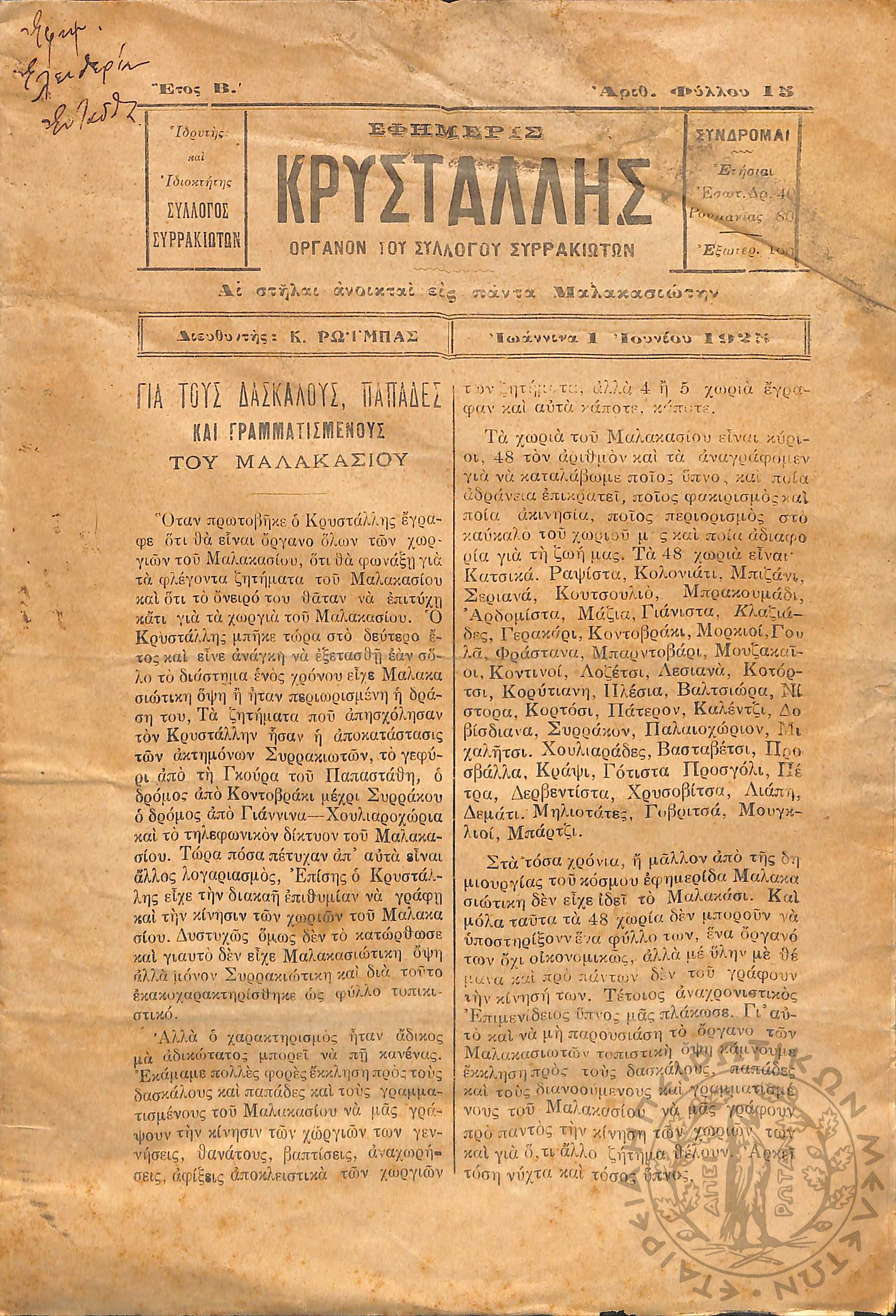 Εφημερίς Κρυστάλλης: όργανον του Συλλόγου Συρρακιωτών, 1925, φ. 15