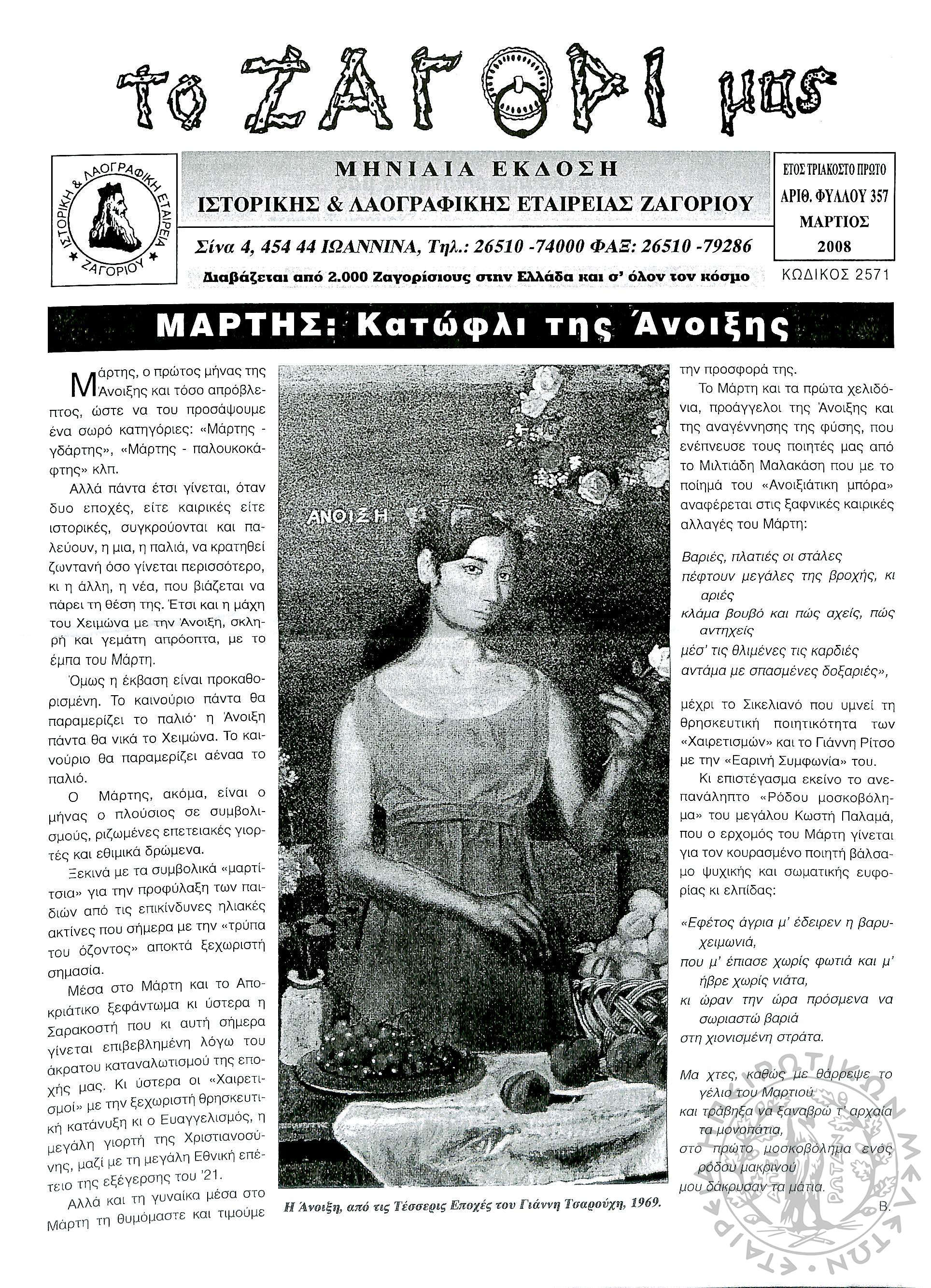 Το Ζαγόρι μας: μηνιαία έκδοση Ιστορικής και Λαογραφικής Εταιρείας Ζαγορίου (φ. 357)Έτος 31, φ. 357...