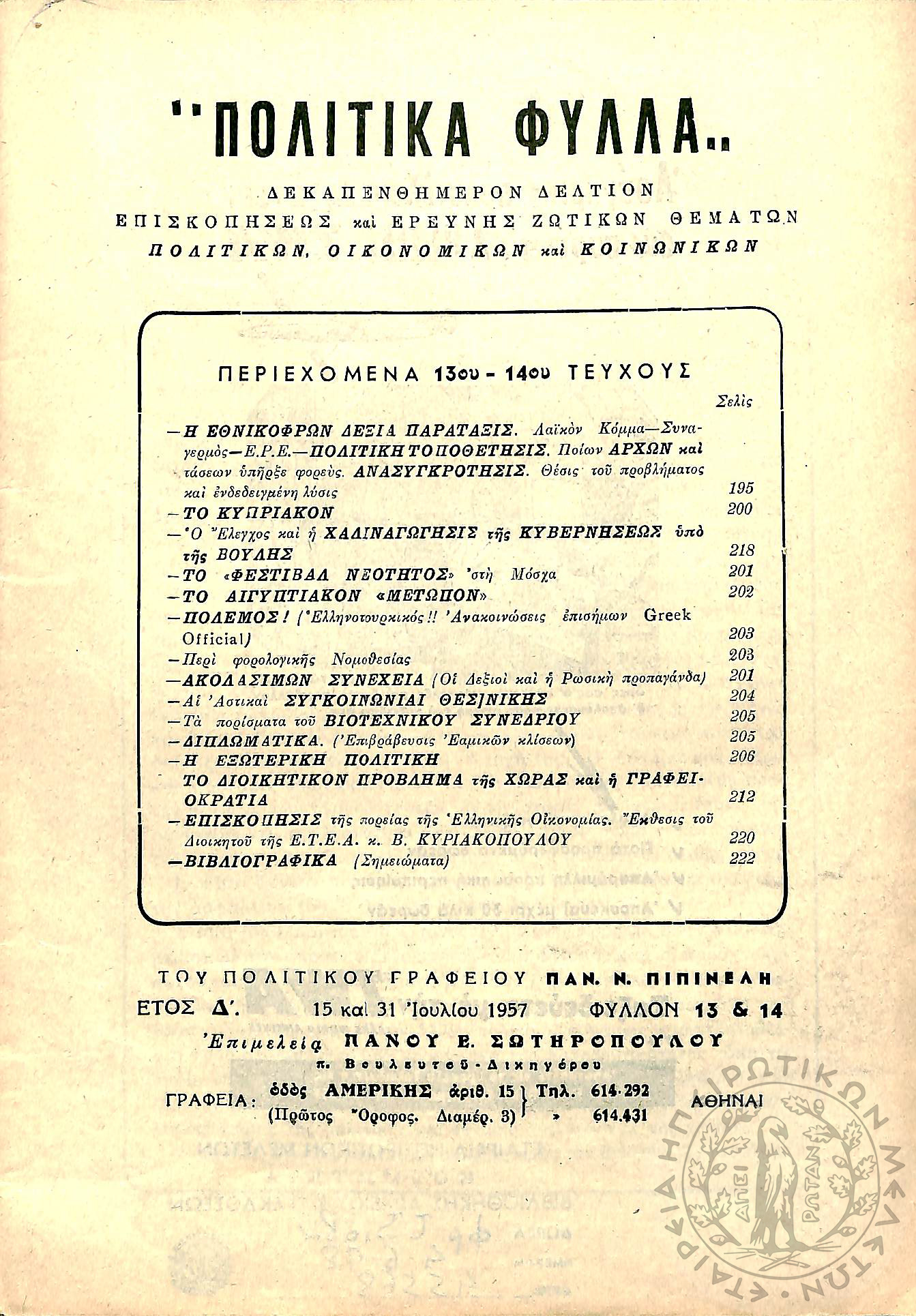 Πολιτικά φύλλα: δεκαπενθήμερον δελτίον επισκοπήσεως και ερεύνης ζωτικών θεμάτων πολιτικών, οικονομικών και κοινωνικών (1957, τεύχ. 13-14)Έτος Δ΄, τεύχ. 13-14...