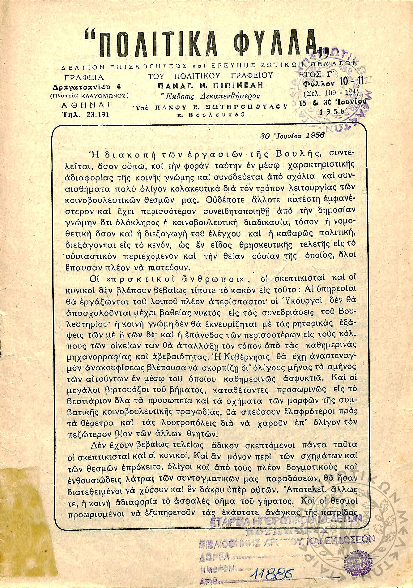 Πολιτικά φύλλα: δεκαπενθήμερον δελτίον επισκοπήσεως και ερεύνης ζωτικών θεμάτων πολιτικών, οικονομικών και κοινωνικών (1956, τεύχ. 10-11)Έτος Γ΄, τεύχ. 10-11...