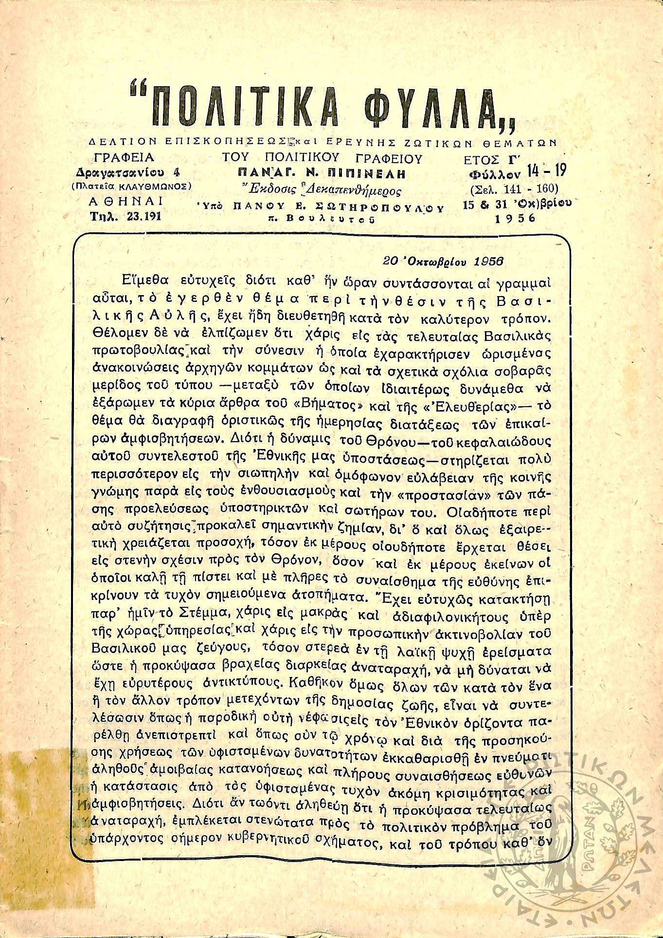 Πολιτικά φύλλα: δεκαπενθήμερον δελτίον επισκοπήσεως και ερεύνης ζωτικών θεμάτων πολιτικών, οικονομικών και κοινωνικών (1956, τεύχ. 14-19)Έτος Γ΄, τεύχ. 14-19...