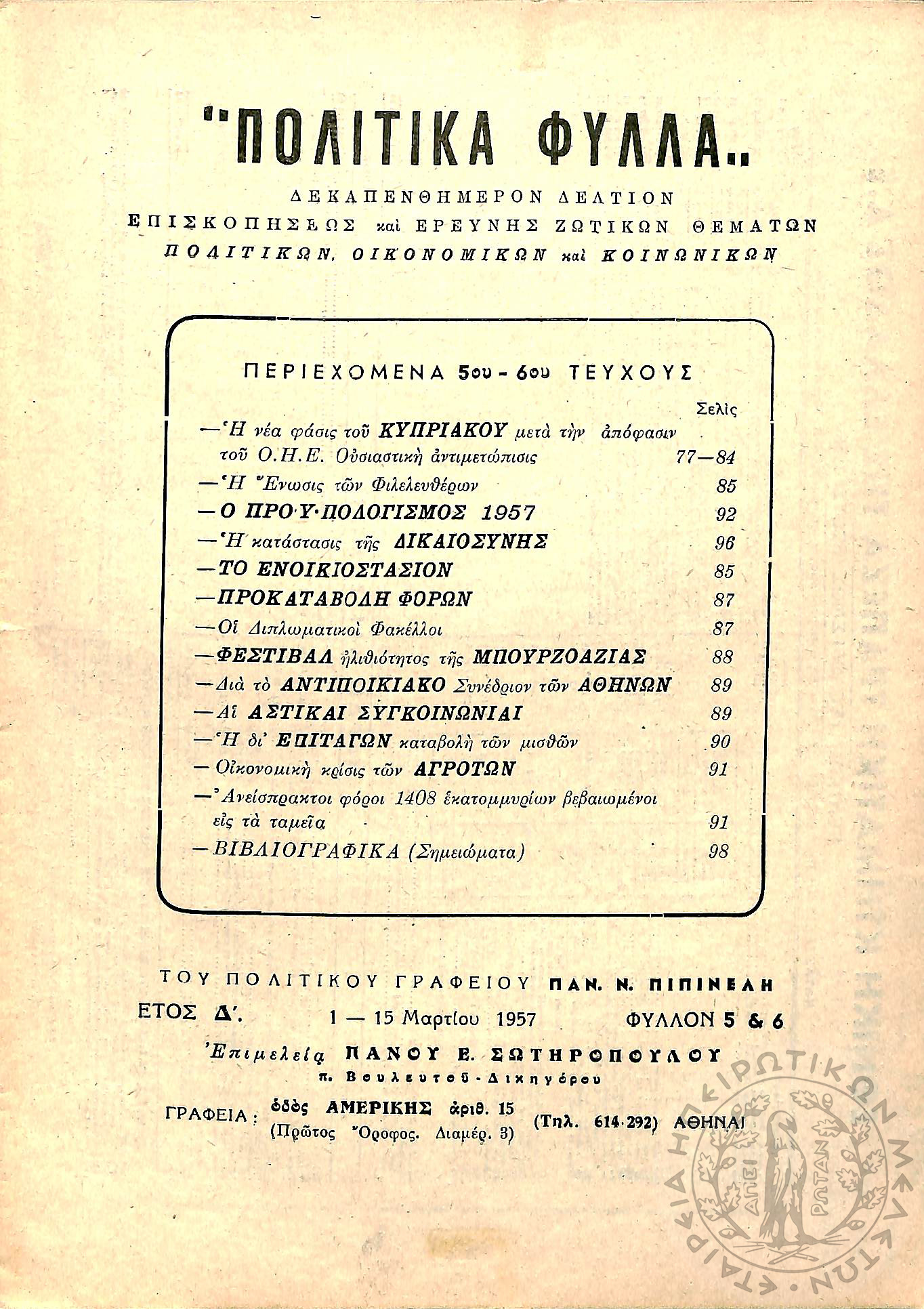 Πολιτικά φύλλα: δεκαπενθήμερον δελτίον επισκοπήσεως και ερεύνης ζωτικών θεμάτων πολιτικών, οικονομικών και κοινωνικών (1957, τεύχ. 5-6)Έτος Δ΄, τεύχ. 5-6...